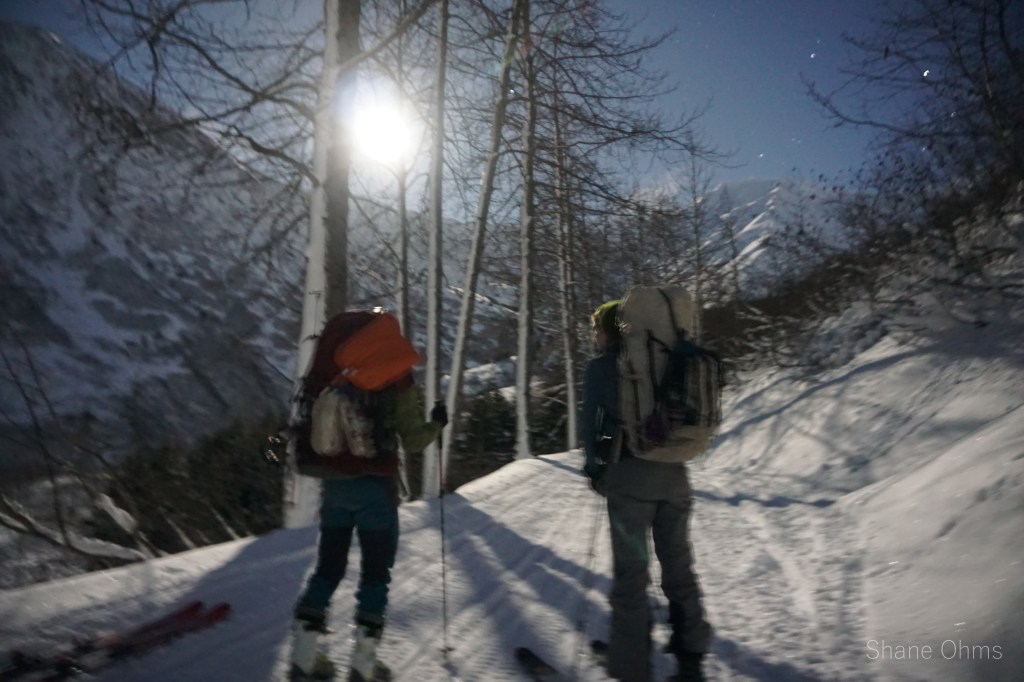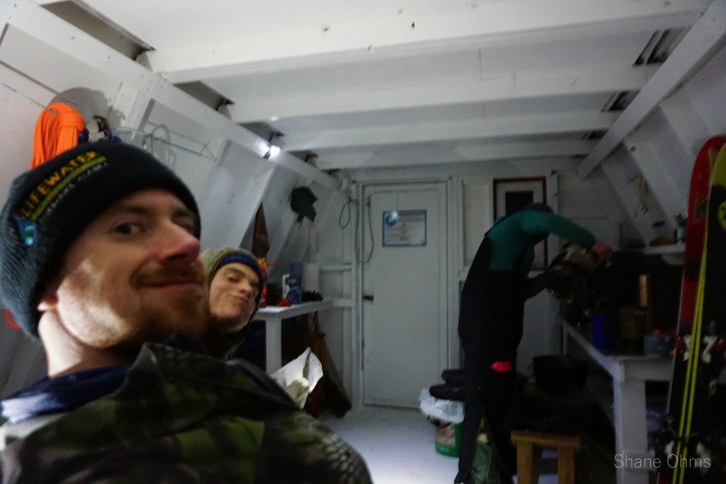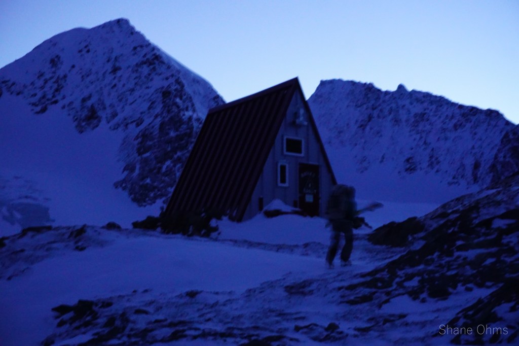 I don’t remember the time, but we must have started pretty early because we reached Crow Pass before the sun did. All the way coming up Crow Pass, the skin tracks of another party weaned in and out of existence and we did our best to follow them. I’ve never really noticed it in all the times I’ve hiked up Crow Pass in the summer, but there is actually a brief section near the top where you’d be sent you over a nasty fall if you started sliding on the crust. This didn’t happen, of course, but when you have a ~30 pound pack and are holding onto a crusted cross-slope by a G3 skin and a metal ski edge, the mind can’t help but consider it a possibility. At the pass, we kept in the shadows and wrapped around to the Raven Glacier. On the Raven Glacier we roped up and headed straight for the Raven Headwall. The Raven Headwall was steep. Just as steep as anything I’d want to ski in the backcountry. We unroped and Sophie set the switchbacking skin track up. Towards the top we switched to booting. As it would turn out, the Raven Headwall had the only soft snow of the entire trip and we definately needed it here. At the top of the headwall we lingered long enough to see the final sunset of 2020 before skiing down for Rosie’s Roost. We overshot it and had to hike back up to the hut, but it was a good sight when we did reach it. By the logbook’s record (and the lack of poop in the poop barrel), we were the huts first visitors since summer. Sophie had packed in 6 beers and we enjoyed 3 of them that nigh, much deserved after a solid day.