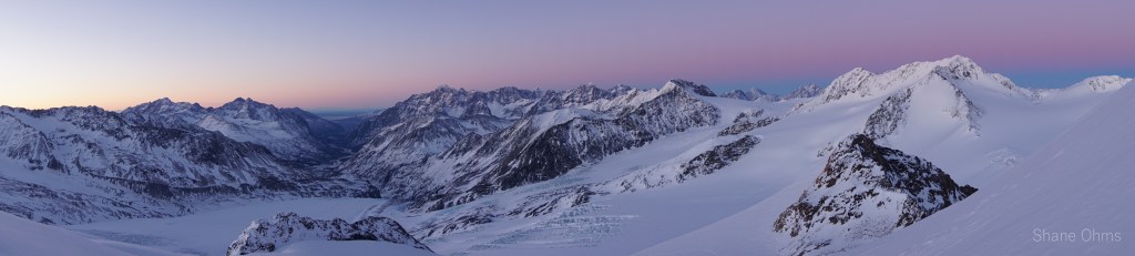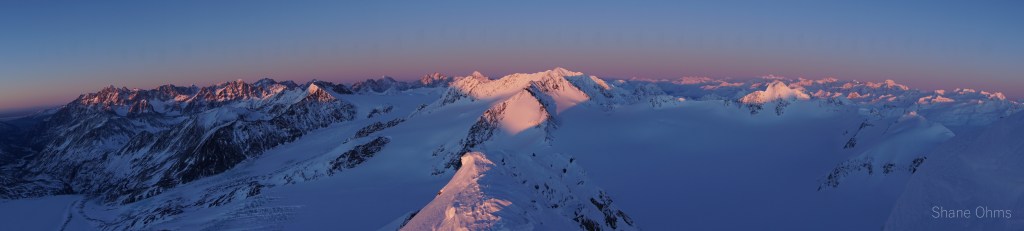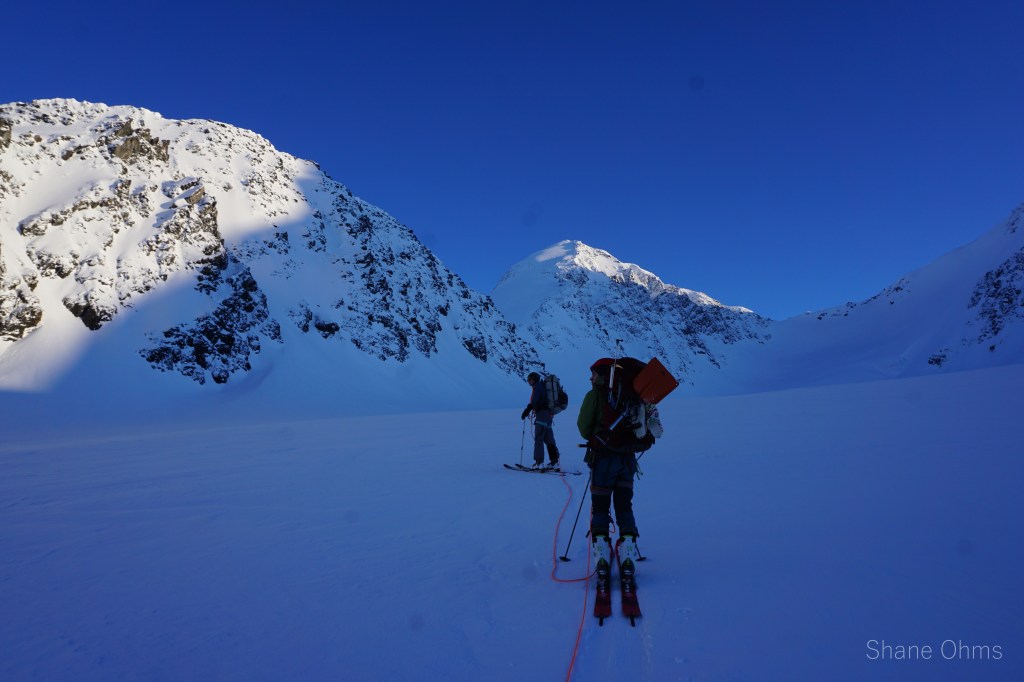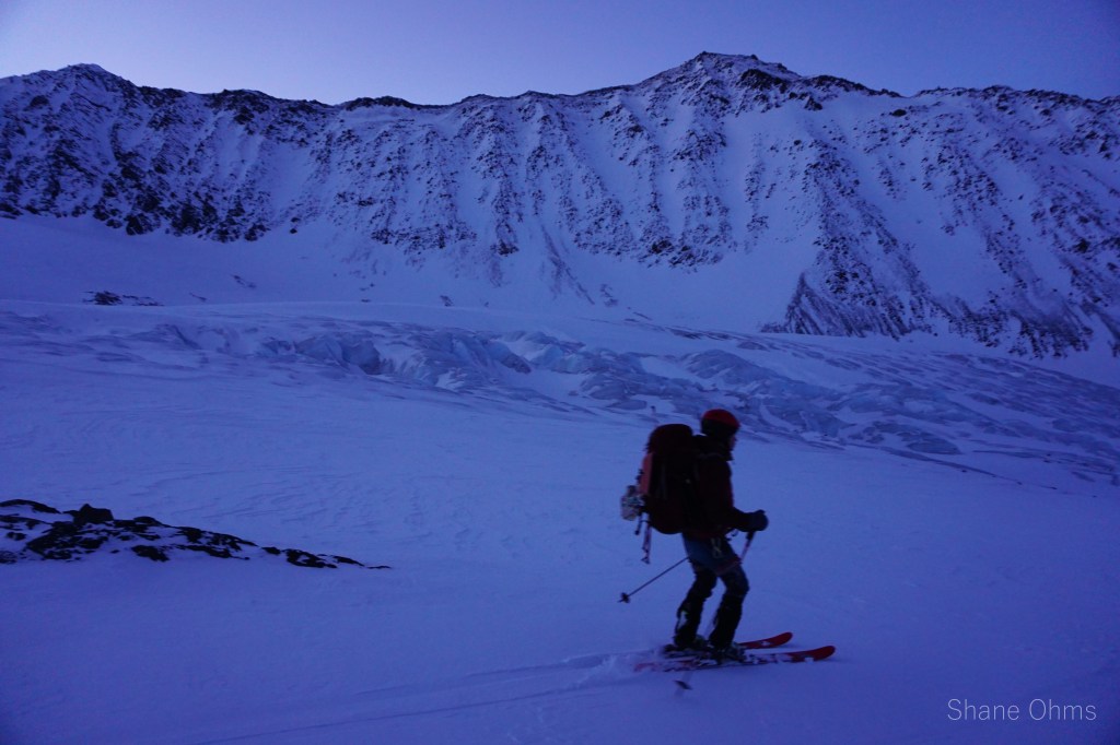 In the morning we left the hut and skied down to the Eagle Glacier to cross, which we roped up for. We worked a pretty large arc around the north side of Roost Peak. Gaining elevation from the Eagle Glacier on the side closer to Rosy Peak than to Roost Peak. At an elevation of about 4500′ we started going straight south toward Roost Peak. Knowing that both the north face and north ridge go, we opted to go for the north ridge in an effort to speed things up by enabling us to ditch the skis and unrope sooner. Well, we made it up to 6400′ before running out of time. It was a spectacular sunset in an area I’d never seen up close until today. We retraced our steps to Rosie’s Roost and I played a round of Farkle with Sophie before bed.