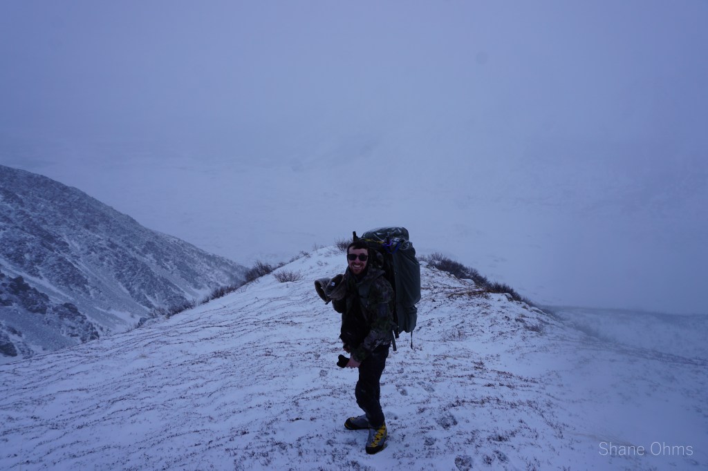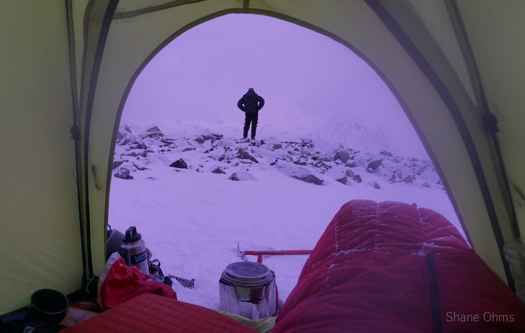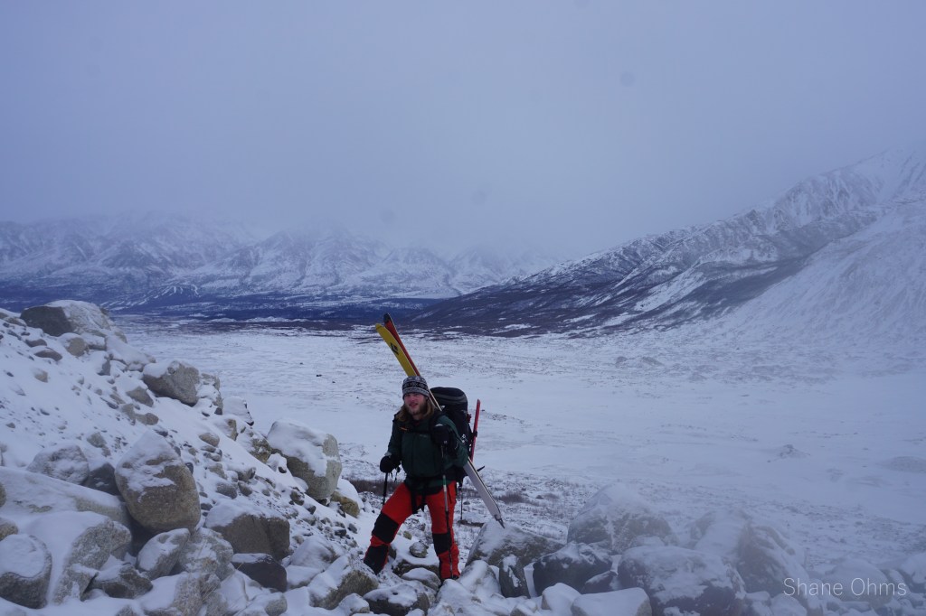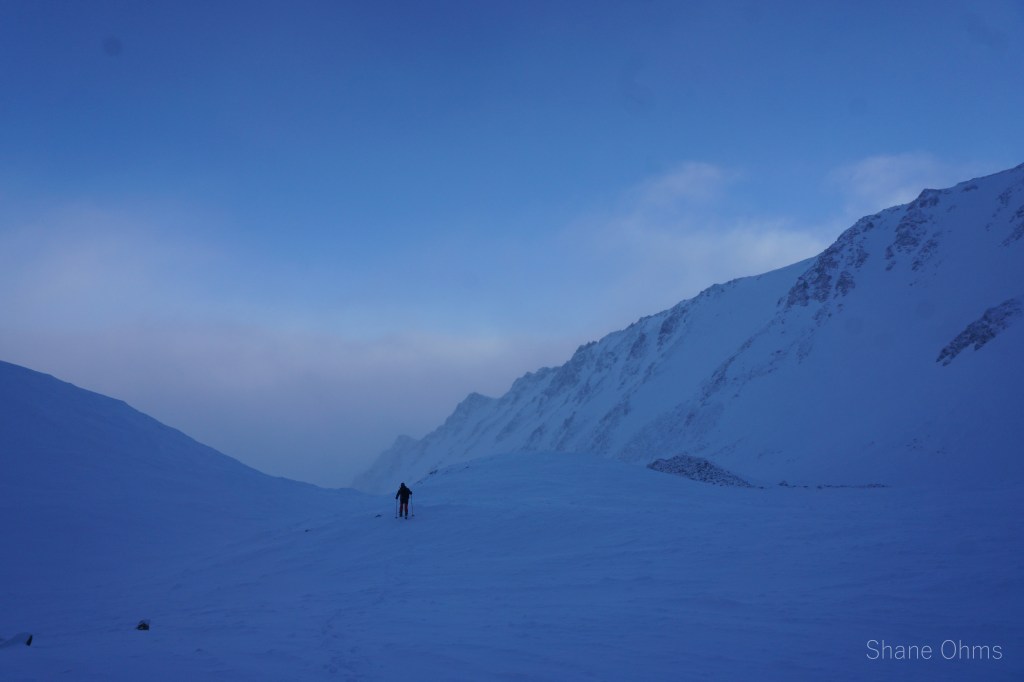 Saturday February 6th 2020 Sean Marble and I departed from a pullout near the Northern Warfare Training Center and made way for the Black Rapids Glacier. The winds were rather strong and since I had left my snowpants in the car, was forced to wrap a quarterzip around my waist in a make-shift orange skirt. I managed like this for the remainder of the trip. We skinned in on downhill skis, which, I think, was a mistake because the valley was so windblasted that we could have simply hiked it in boots and shaved a lot of weight (maybe bring snowshoes for some super short sections). Hind sight is 20/20. Eventually our skis were ditched at 3200′ on the way up into the bowl east of Peak 8230. On a little ridge between two drainages we continued up to 4500′ where we made camp and turned in early. Sean melted an endless supply of snow and I ate a peanut butter pad thai meal that brought on a wonderful food coma. We’d spent the first day underneath the clouds, but in the morning we would climb out of them.
