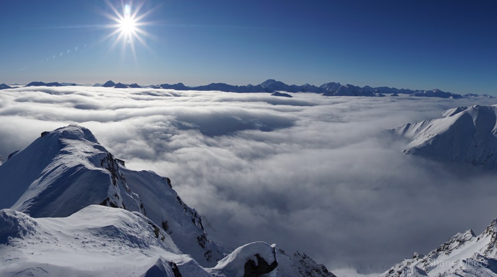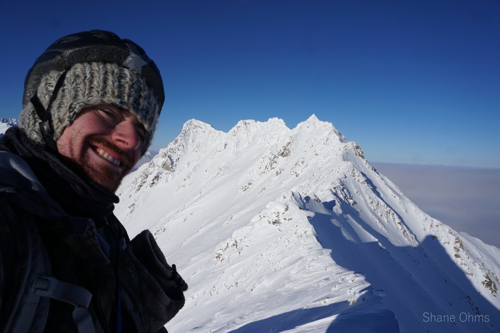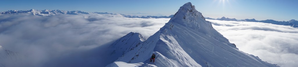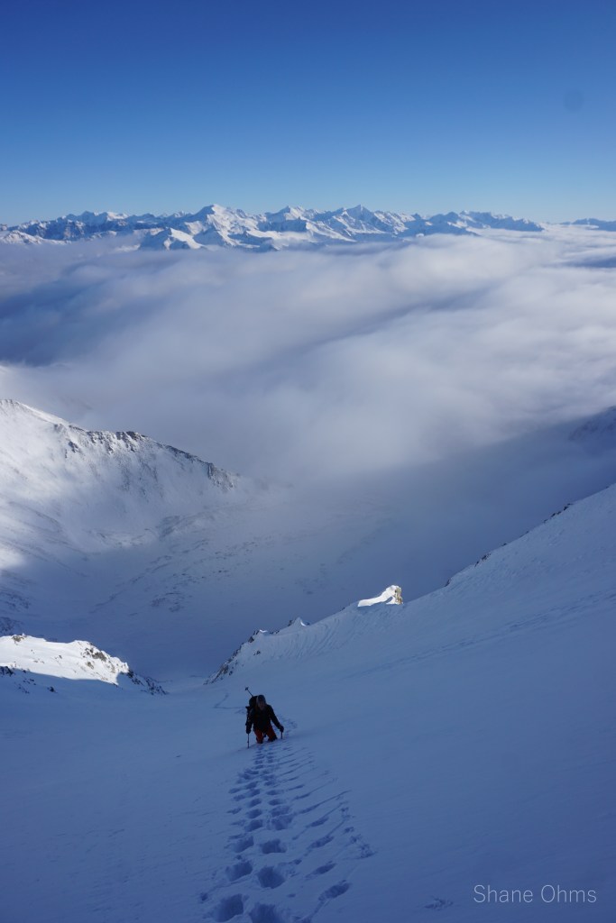 We tried to get up early (7 or 8am), which isn’t a ton of fun when it is a chilly winter morning. We continued up the bowl, around the Gale surveyor point. At 6500′ we reached the base of a nice steep couloir. If it was much steeper (or the snow harder) I would’ve found it mentally exhaustive, but as it was; it was a good boot up. Half way up we realized that we’d be out of the clouds. Well, I thought we were half way up. In truth that was at about 1/3 and the couloir just seemed to drag on and on. Sean and I traded off setting the boot pack. Once on the ridge we could see our intended peak; Peak 8230. It was a quick and unanimous decision that we didn’t have the time to take it on. I trudged south to take some photos on a little perch that barely broke 8000′, making it the highest I’ve ever been in the winter. The views from above this sea of fog were spectacular. Only three other times have I been graced with observing a scene from above a sea of clouds; North Suicide Peak, East Twin Peak, and Nest Peak. It is a divine and rare treat.