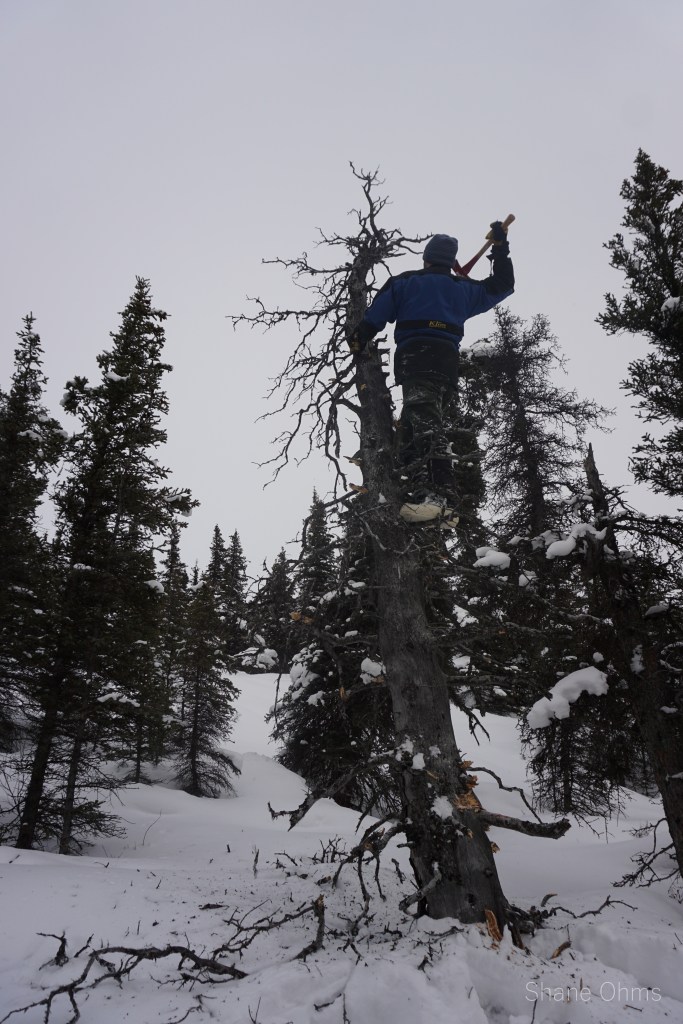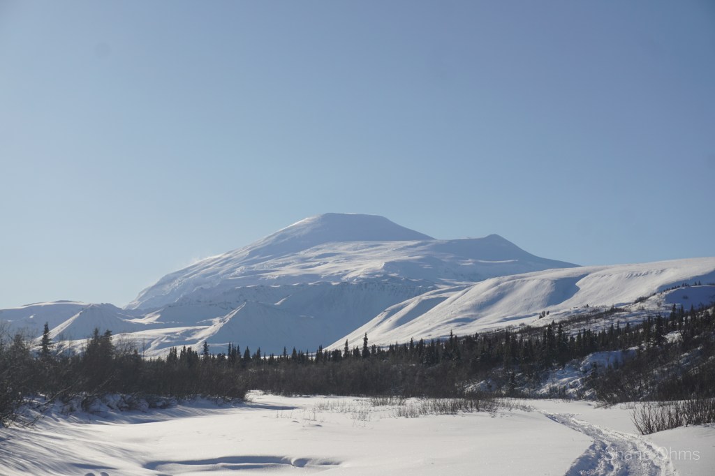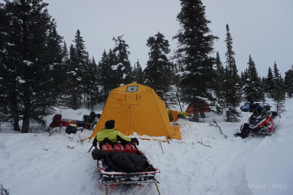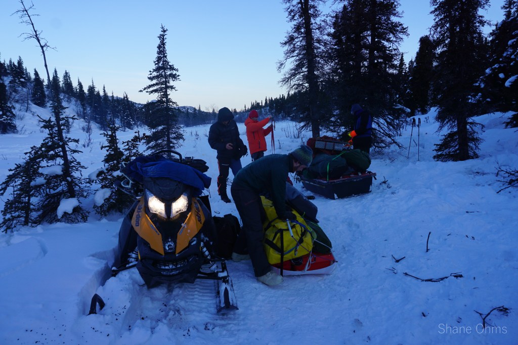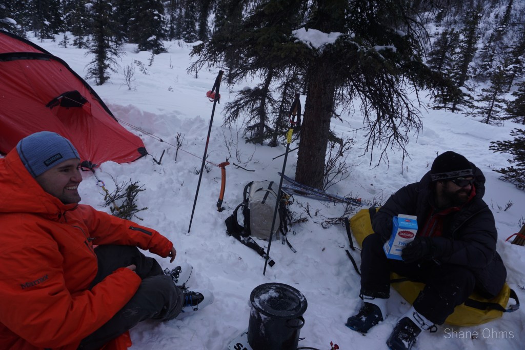 On Saturday March 6th we went in. Gerrit Verbeek and I hopped on the first wave with all our gear while Sawyer Huffman, Sophie Tidler, and Ryan Bish skinned in until their ride would come back. Crossing the Copper River went well because the river had frozen up about a week earlier (crossing the copper river is sometimes a deal-breaker itself). Some snow bridges in Boulder Creek caused pause to consider if they’d hold the weight of the snow machines -they did. And alas, we made it about 20 miles back to where a good protected spot in the trees was selected for the big wall-tent. We set up base camp while the three remaining skiers were picked up and brought in. That night, our spirits were on varying levels of acceptance concerning how the goal of Sanford was no longer realistic. When I got home from the trip, I wrote a poem poking fun at our defeat.