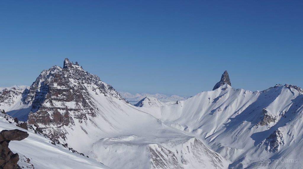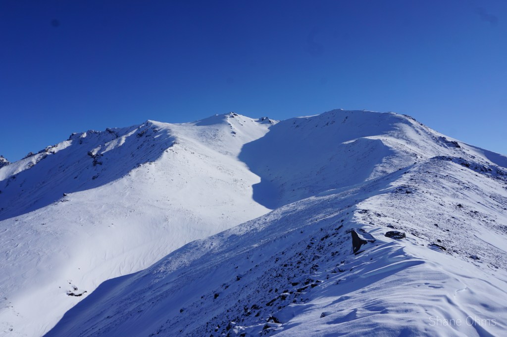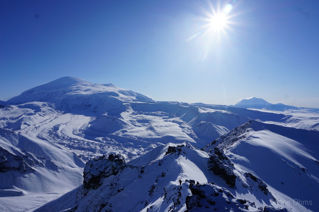 Anyways, the 5 of us hopped on Truth Peak’s low angle northwest ridge as soon as we could. Snow cover was weak in places, but that is what skins are for, right; to protect the bases? At nearly 6000′ Sawyer and Ryan couldn’t ignore their blisters anymore. They were also out of water. So after a snack break with prime views of Sanford on a splendid day, they would go down to Boulder Creek and then back to base camp. Sophie, Gerrit, and I continued up. I split off at a little col. to skin up the west bowl/face because I figured it’d be faster and also because I wanted to feel out how much snow cover we would have for the ride down (it was enough to be playful!). Sophie and Gerrit continued up the ridge which curved into the more scrambley south ridge. As I watched them do some moves with their skis strapped to their backpacks, I was glad to have been able to skin (almost) all the way up. I placed a registrar and we enjoyed great views. Capital Mountain’s full relief was being hidden by some other gnarly blocks on the ridge between us, so what actually intrigued me the most was a spire to the south of Capital Mountain. But that’s not to say Sanford and Drum didn’t make for the most gaping view -because they did. Two Alaskan giants… for another day.