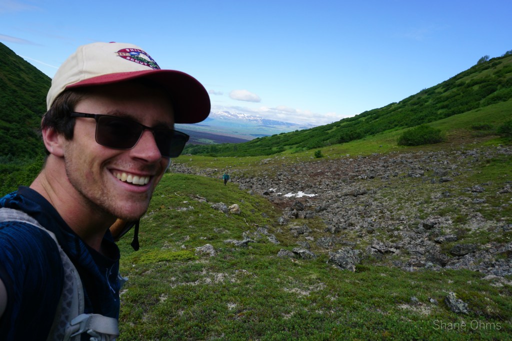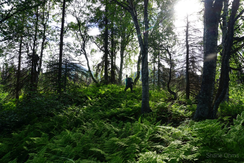 For this trip, we started with a boggy walk under power transmission lines, followed by a walk through open woods on an occasionally flagged trail. At one point, it brought us to a major bear baiting station (a caution if you go in times of active bear hunting). Fortunately, no bears were found. Next was the moose ‘trail’, which was pretty painstaking as we forced our way through dense, rigid alders. Next was the low shrub clearing (very nice), followed by some sidehilling on the caribou trails as the stream rose to meet us on our contour. Now we were in the tundra valley.