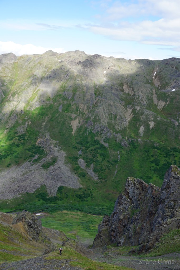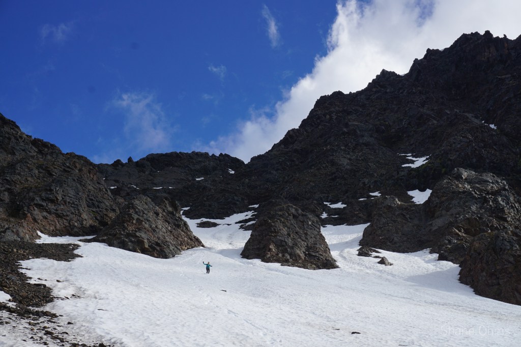 For the descent, I wanted to poke a gully on the north side a little ways further east on the ridge. If the gully was a go, it would save us decent time. If it didn’t… well, we’d just have to backtrack on the west ridge.