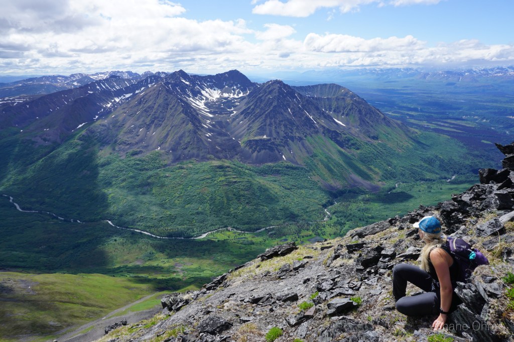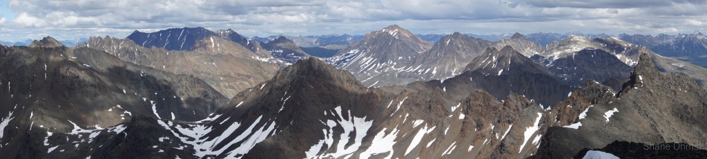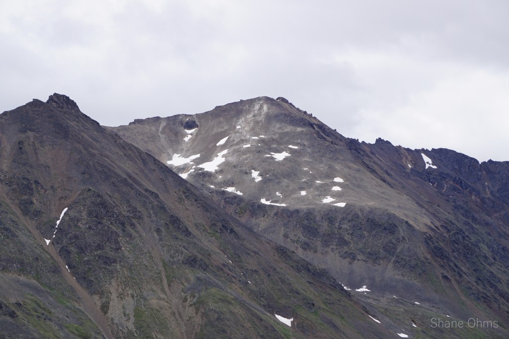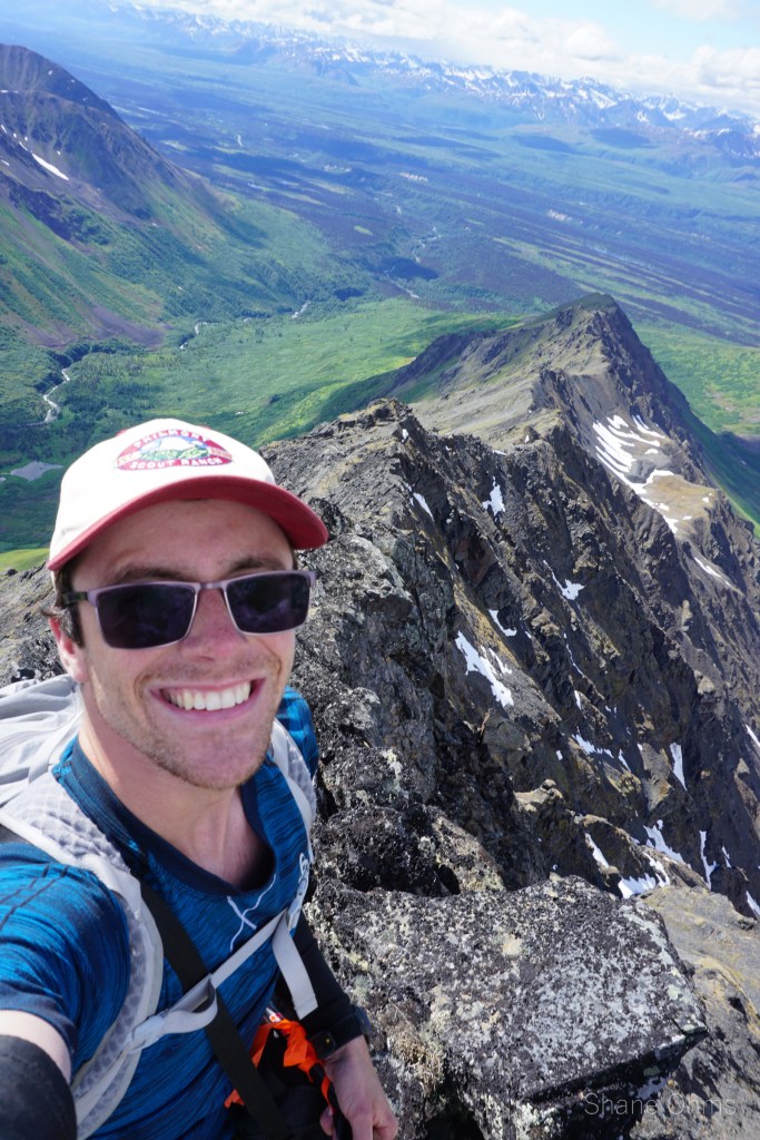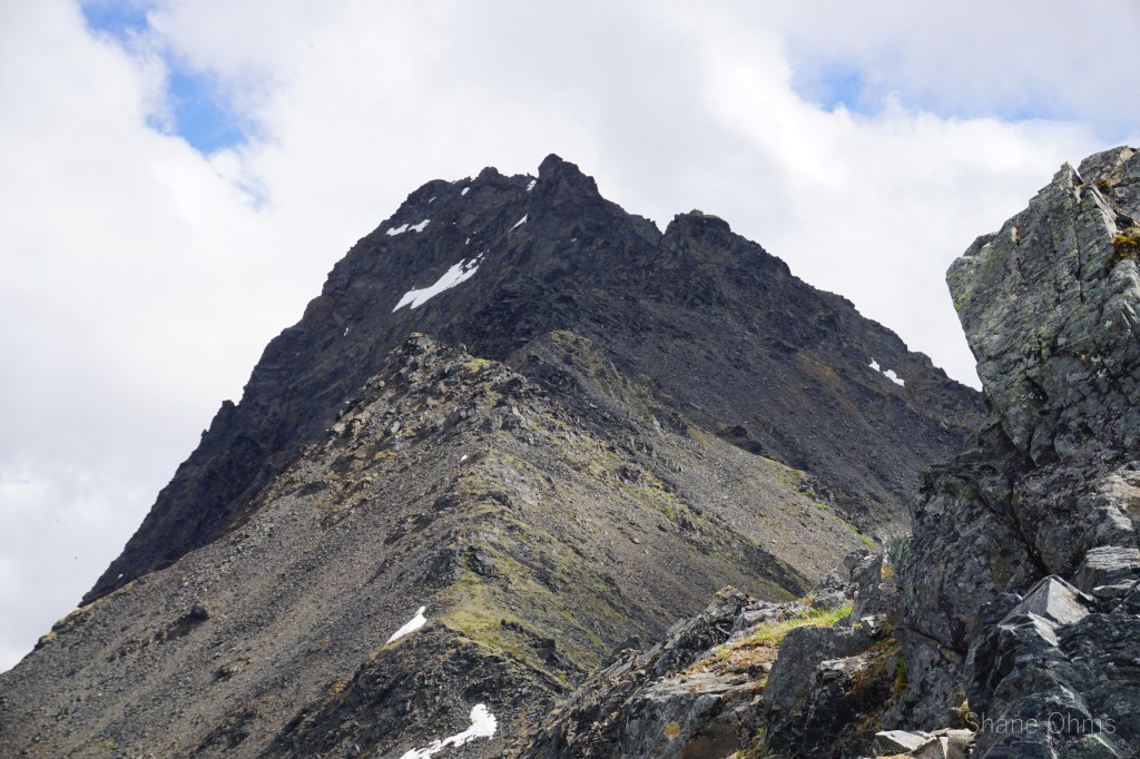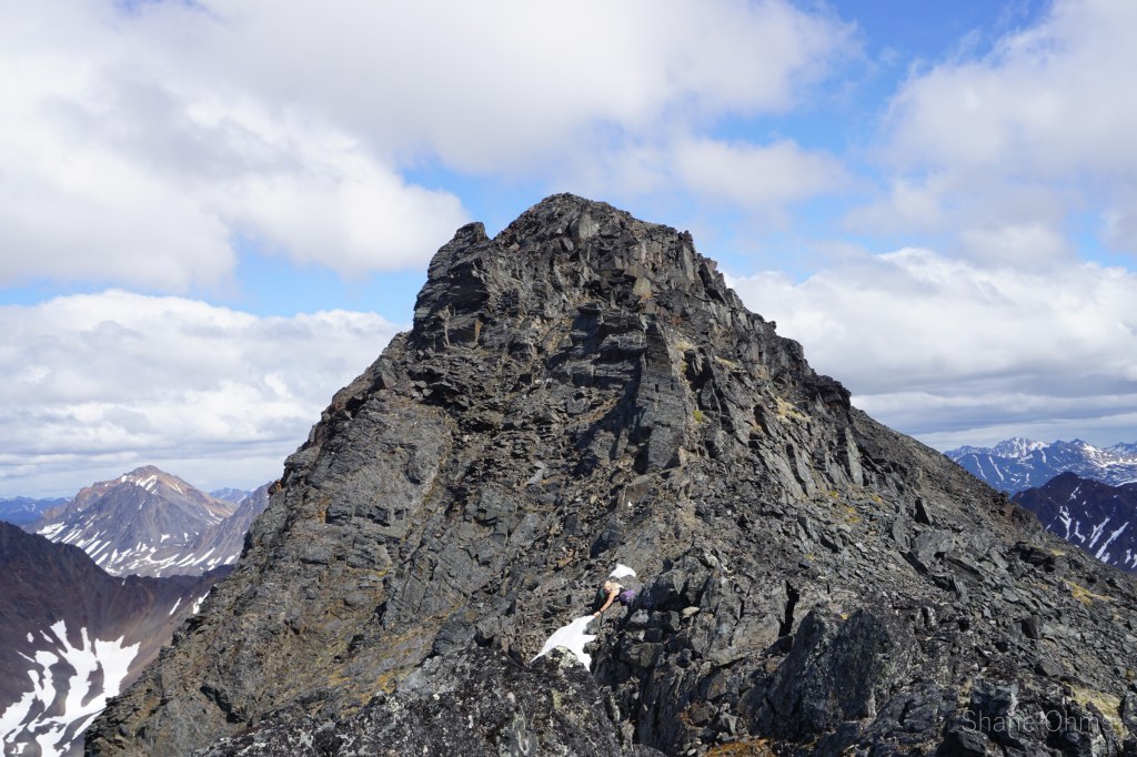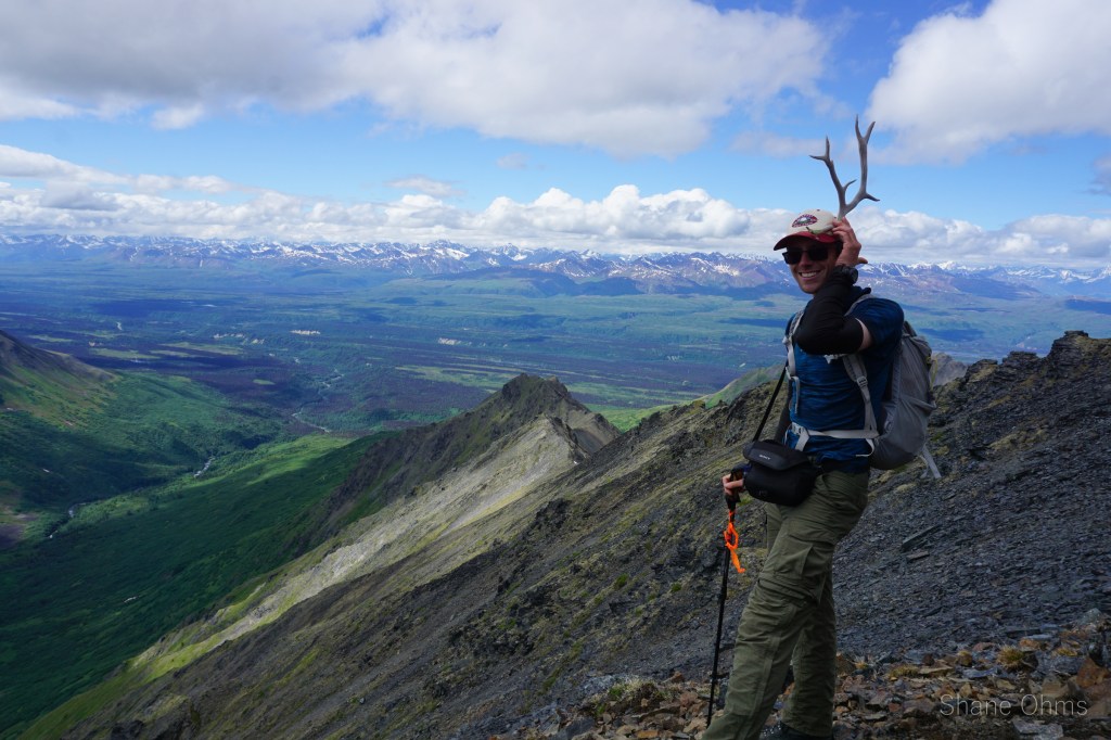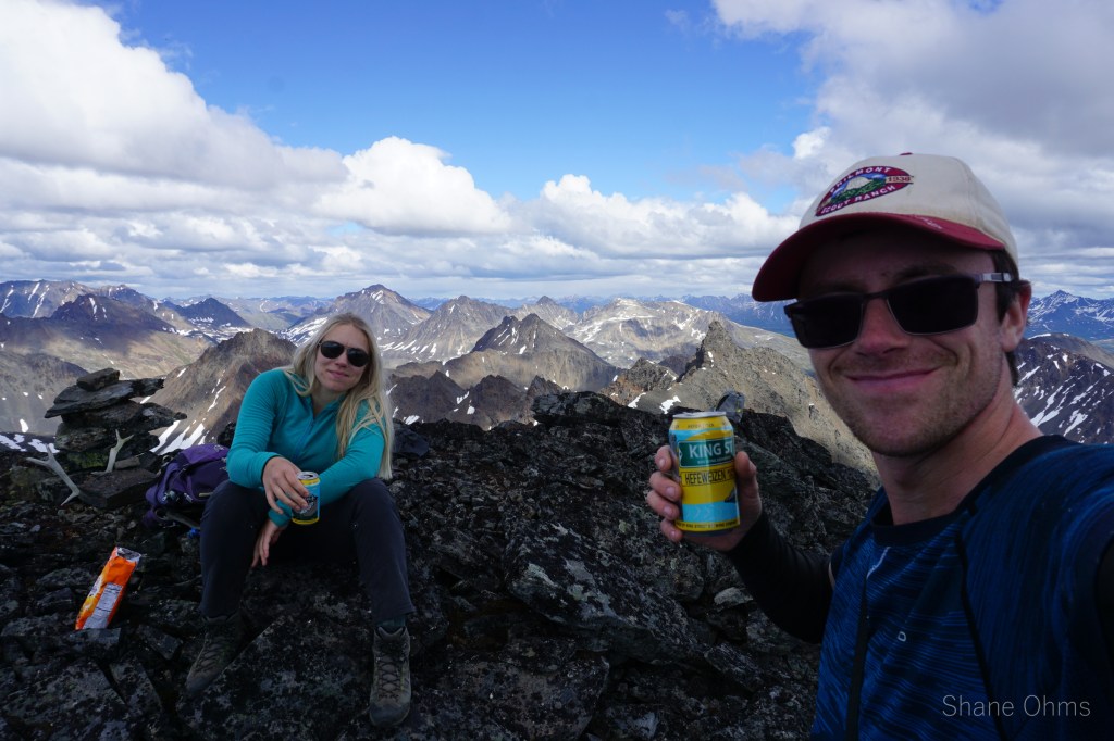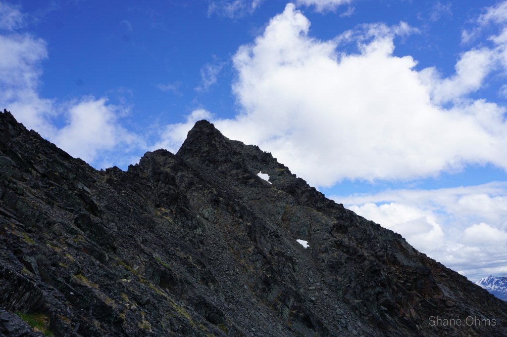We summited at 4:30 pm, finding no signs of prior ascents on top. We built a carin fashioned with a caribou antler I’d found on the ridge 500′ below the summit. We enjoyed views of Denali, cool beer, and salty goldfish, and I took good pictures of the Elementary Peaks to the north for future use.