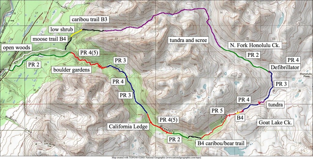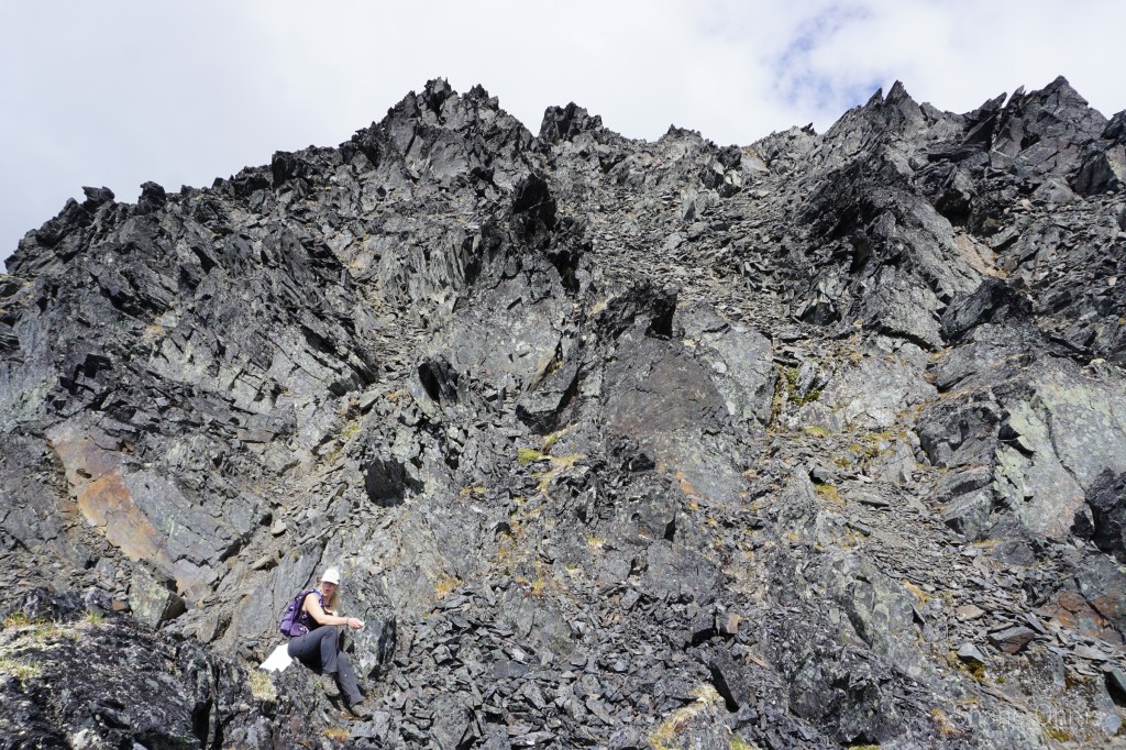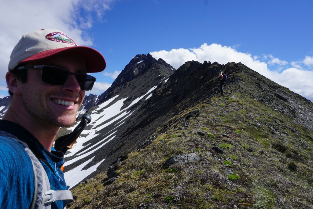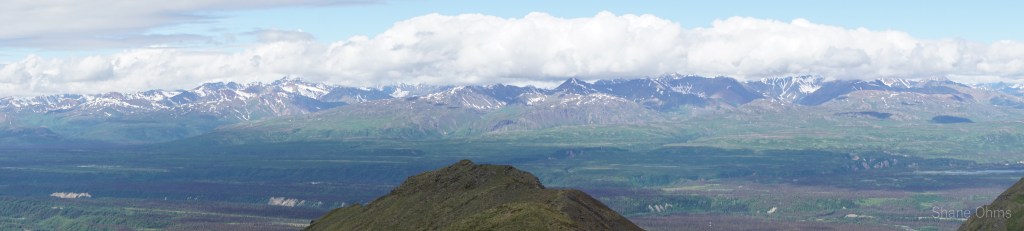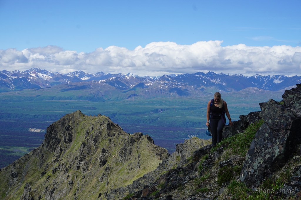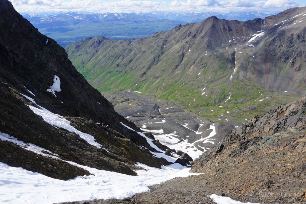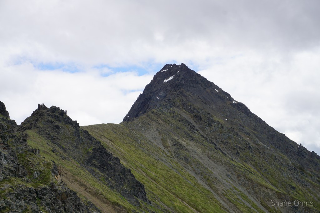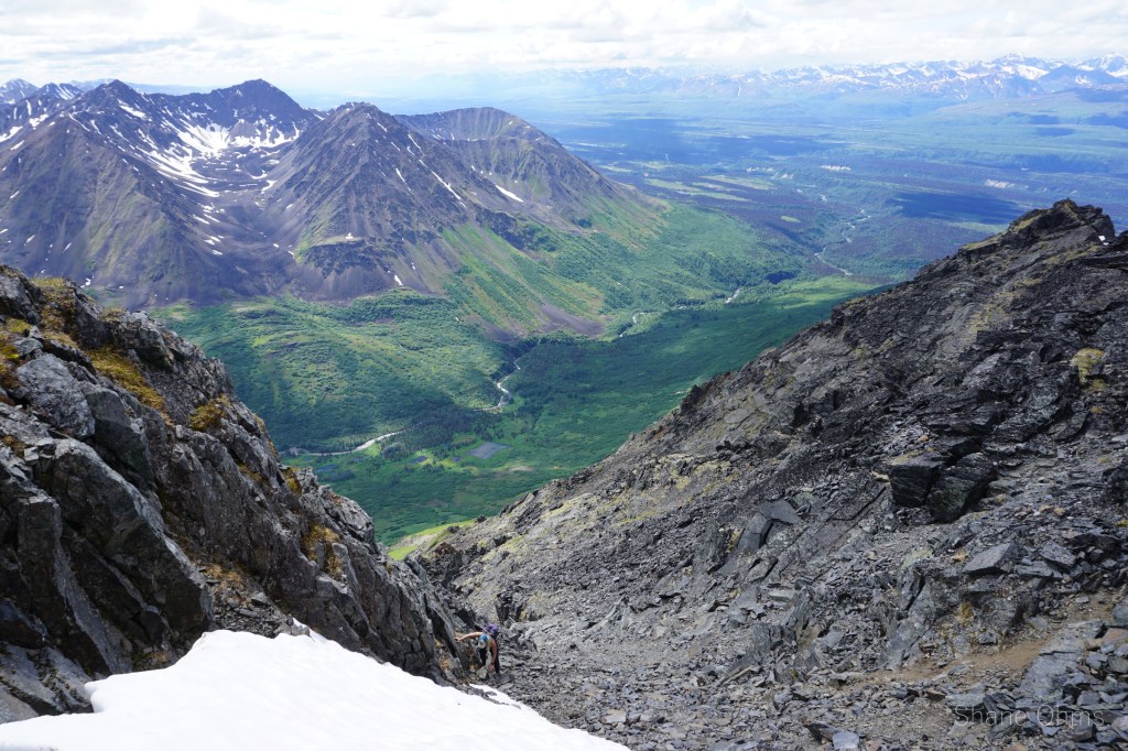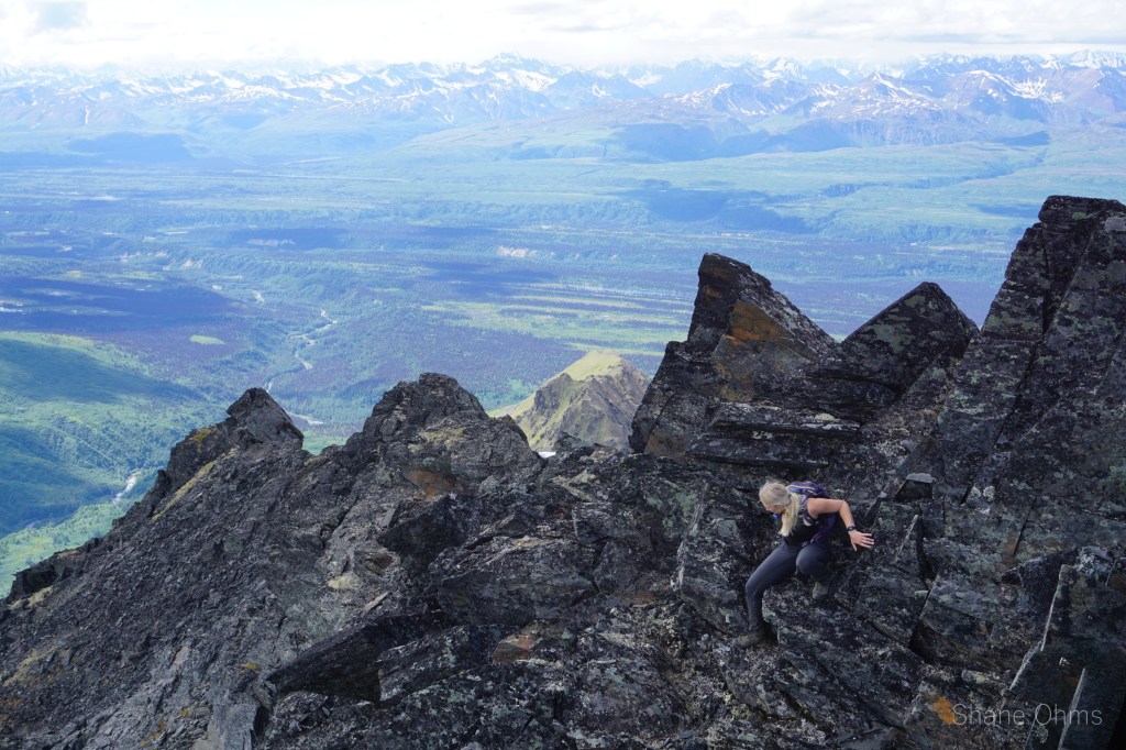 We summited at 4:30 pm, finding no signs of prior ascents on top. We built a carin fashioned with a caribou antler I’d found on the ridge 500′ below the summit. We enjoyed views of Denali, cool beer, and salty goldfish, and I took good pictures of the Elementary Peaks to the north for future use.