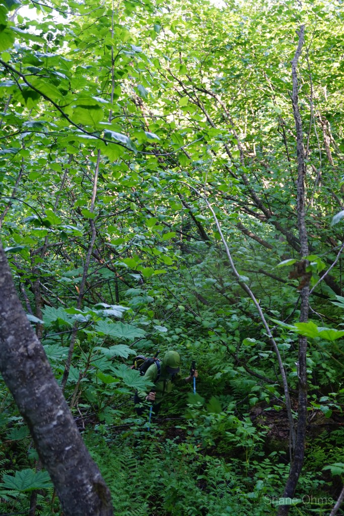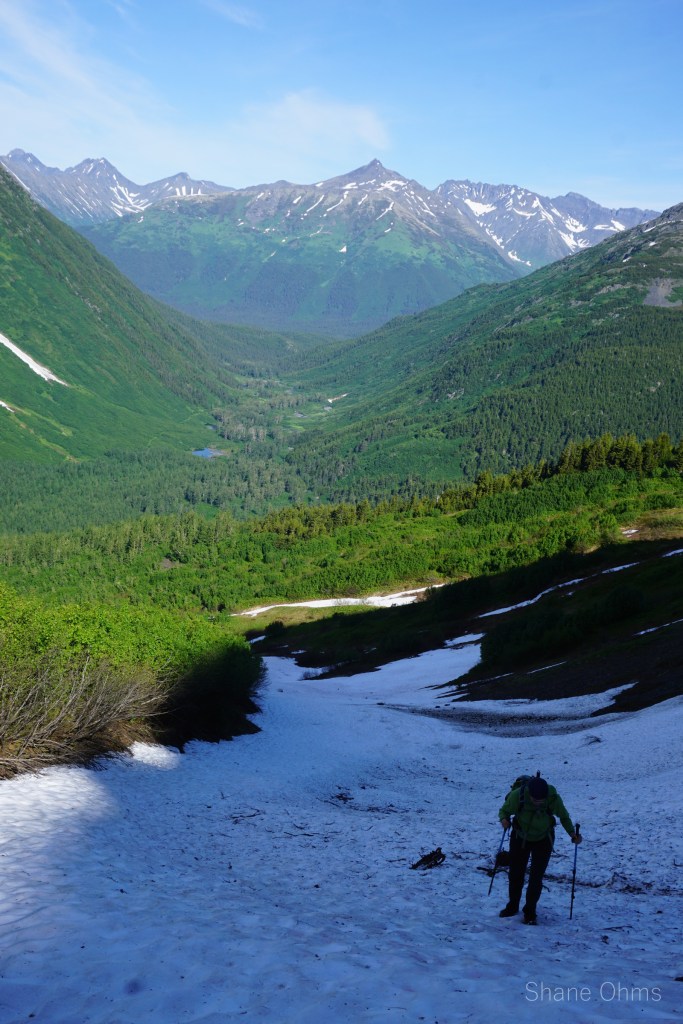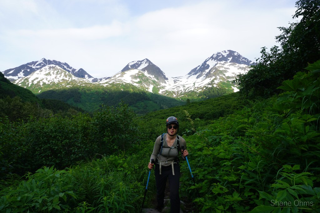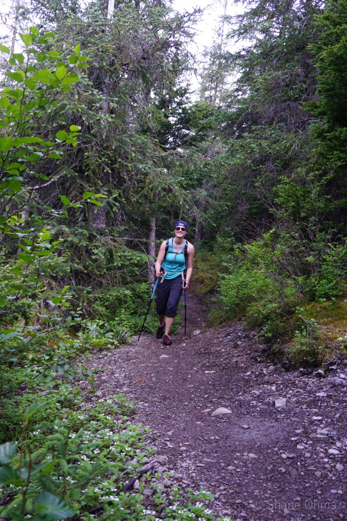 Sophie Tidler and I left Anchorage for Girdwood at 6am. Leaving early wasn’t essential for the sake of time, but was nice so we could beat the heat of day. From the Alyeska hotel overflow parking area we biked in about 2 miles of the winner creek trail. It’s not a lot of miles, I know, but both ways it adds up to 4 miles and we found them advantageous to bring. Note: mountain bikers will bike the Winner Creek Trail all the way to Berry Pass, and we saw their tire marks for as far as we went on this trip. Also note: we are not mountain bikers. After about 2 miles the bikes became more bothersome than they were worth and we abandoned the bikes.