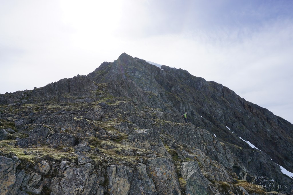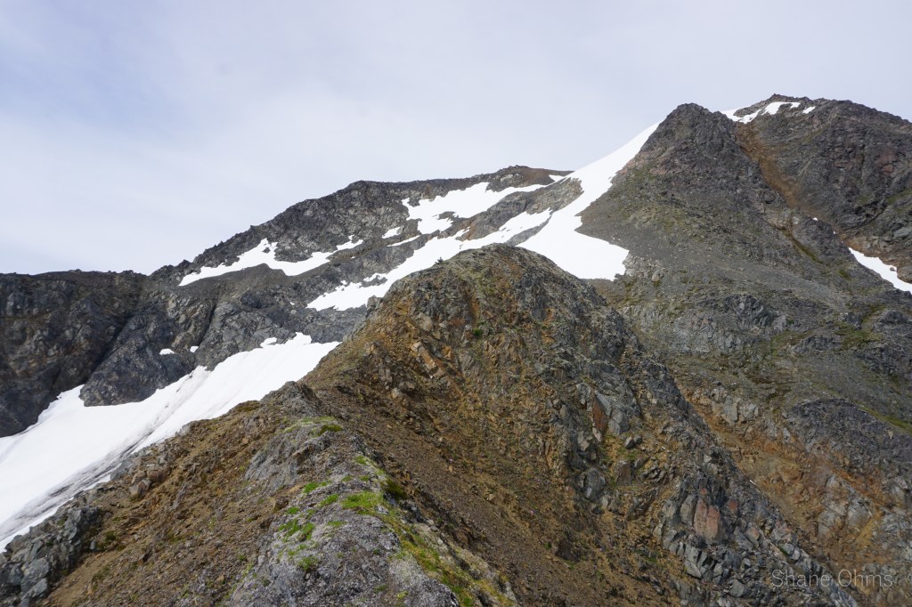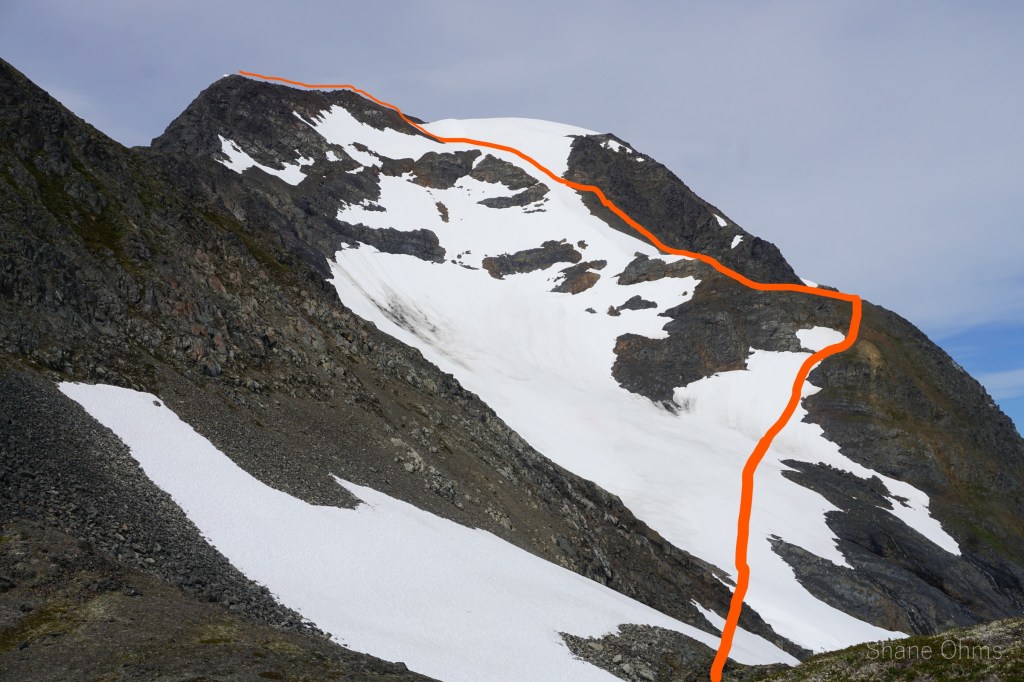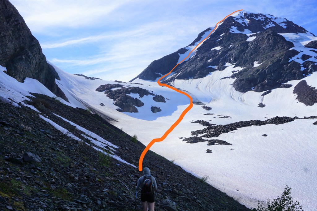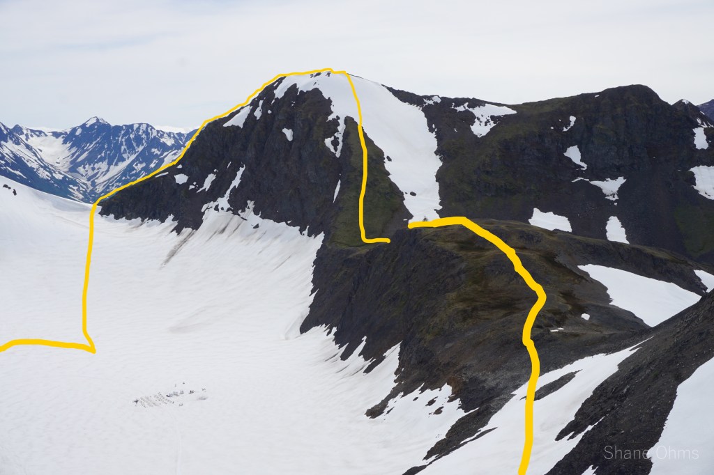 West of Girdwood, surrounding the Punchbowl Glacier, are a striking yet low elevation cluster of mountains I refer to as the Berry Peaks, each peak named after a different type of berry. Sophie and my’s objective was for the highest one, Highbush Peak, likely followed by Lowbush, then by Lingon if we still had energy for it. (And we would have energy for it). We invited our friend Gerrit Verbeek, but coincidentally he’d, just 3 days prior, climbed Nagoon and Lingon Peaks. Gerrit declined, but he produced to me via text a photo of Highbush Peak from his position on Lingon. This was important because we had originally planned on climbing Highbush via the standard route which involves dropping to the punchbowl glacier and ascending the southeast ridge… but his photo revealed a neeearly continuous snow line on the north face. Hmmmmmm, tempting. This photo gave us the confidence to probe the line out, and it proved to be a very wonderful line, making for a Berry Wonderful Loop.