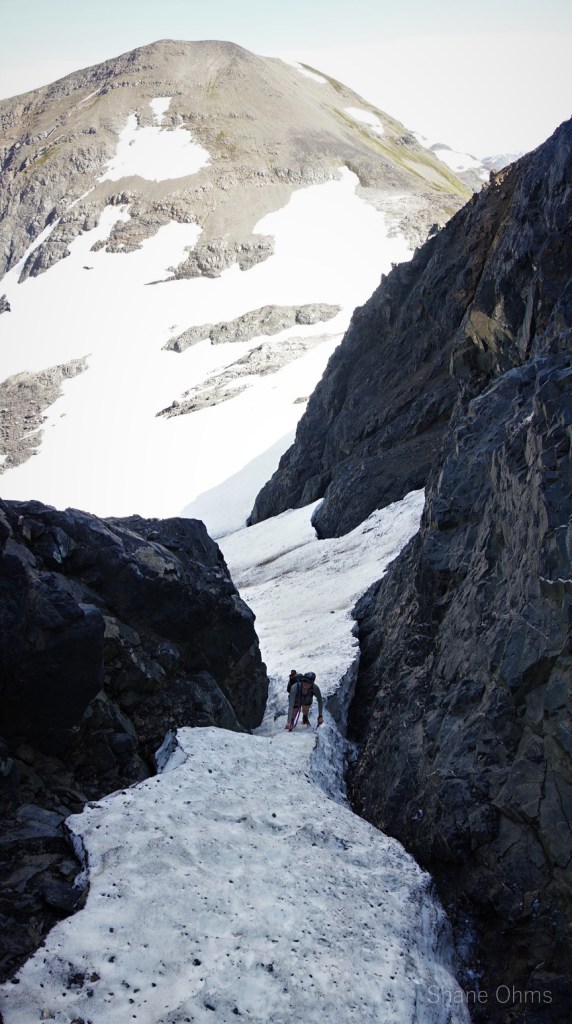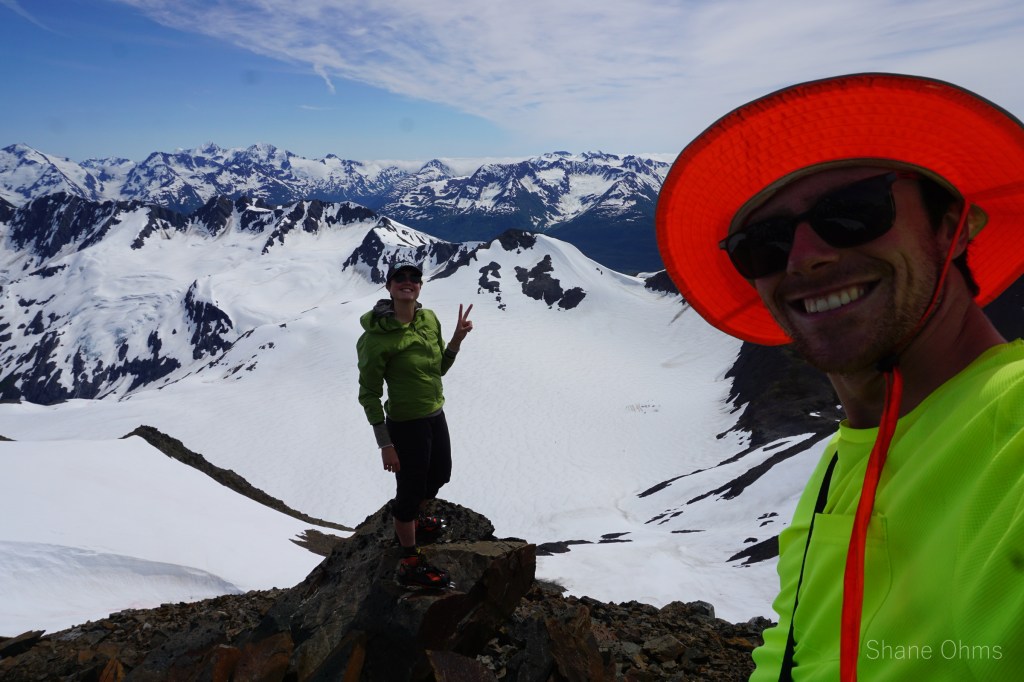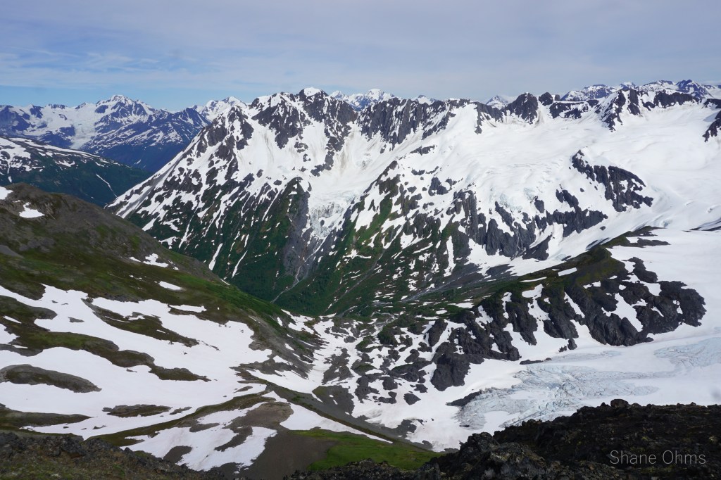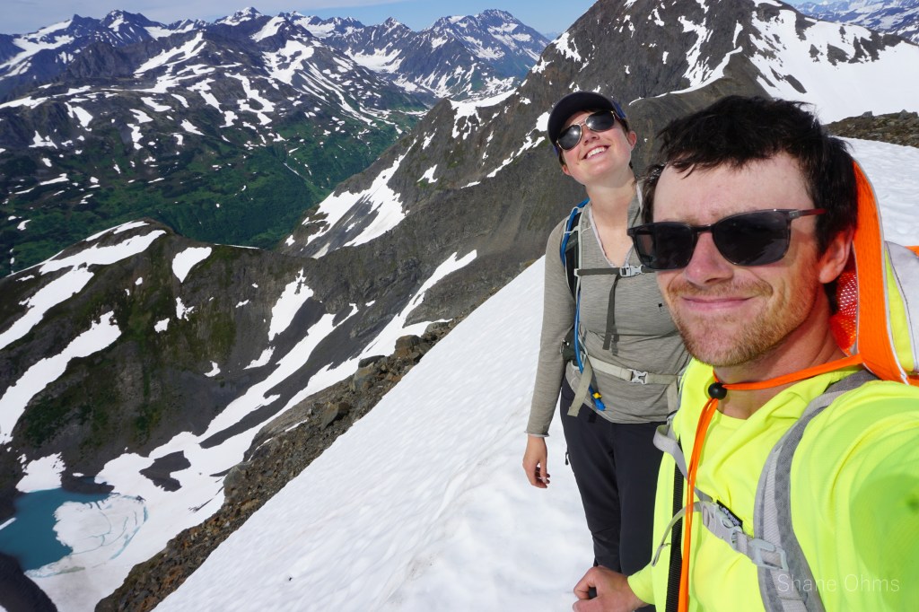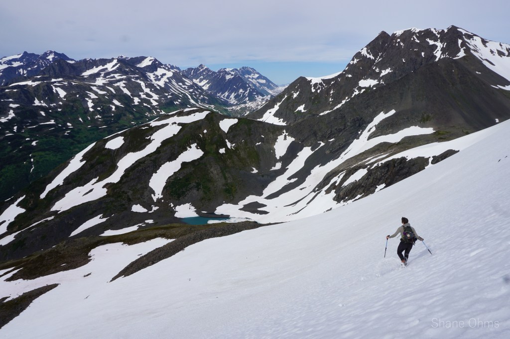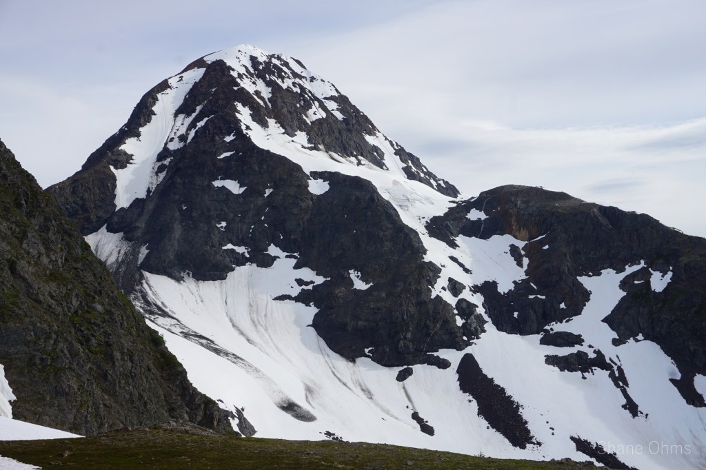 West of Girdwood, surrounding the Punchbowl Glacier, are a striking yet low elevation cluster of mountains I refer to as the Berry Peaks, each peak named after a different type of berry. Sophie and my’s objective was for the highest one, Highbush Peak, likely followed by Lowbush, then by Lingon if we still had energy for it. (And we would have energy for it). We invited our friend Gerrit Verbeek, but coincidentally he’d, just 3 days prior, climbed Nagoon and Lingon Peaks. Gerrit declined, but he produced to me via text a photo of Highbush Peak from his position on Lingon. This was important because we had originally planned on climbing Highbush via the standard route which involves dropping to the punchbowl glacier and ascending the southeast ridge… but his photo revealed a neeearly continuous snow line on the north face. Hmmmmmm, tempting. This photo gave us the confidence to probe the line out, and it proved to be a very wonderful line, making for a Berry Wonderful Loop.