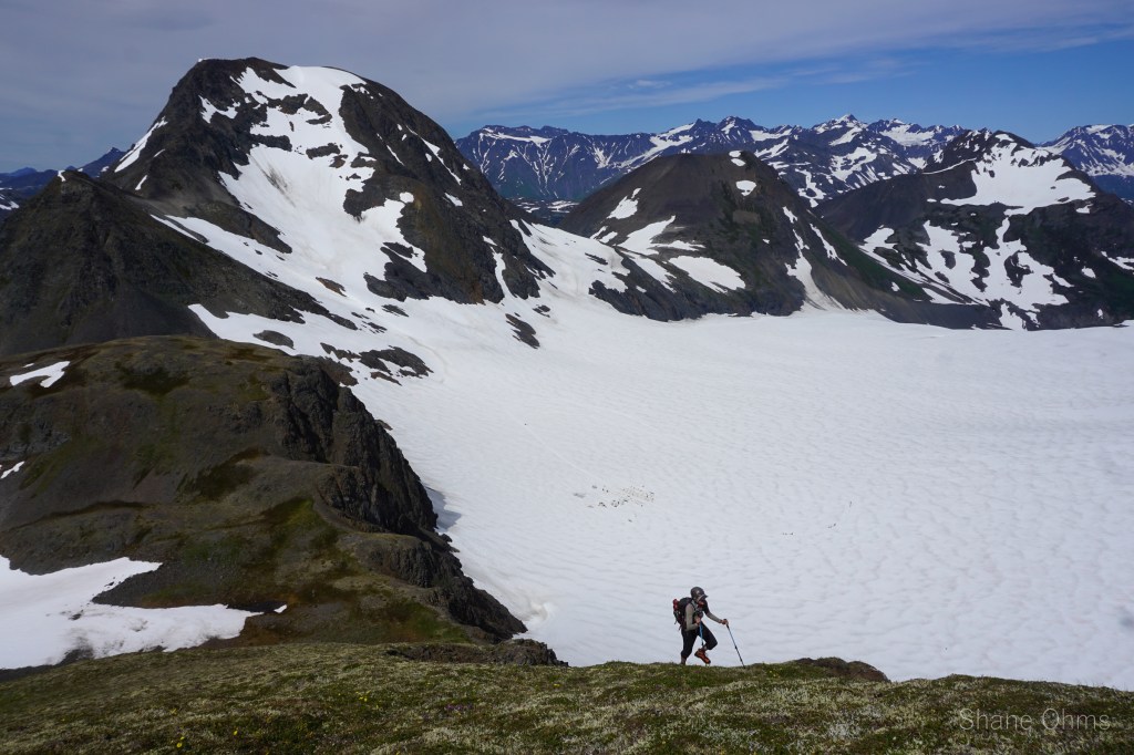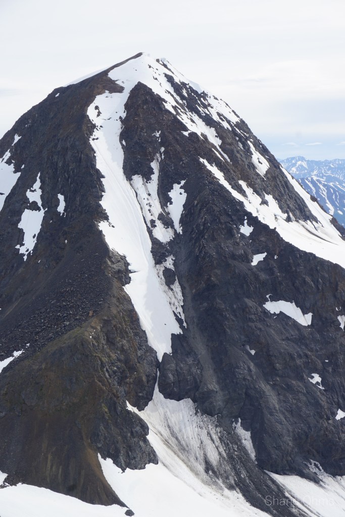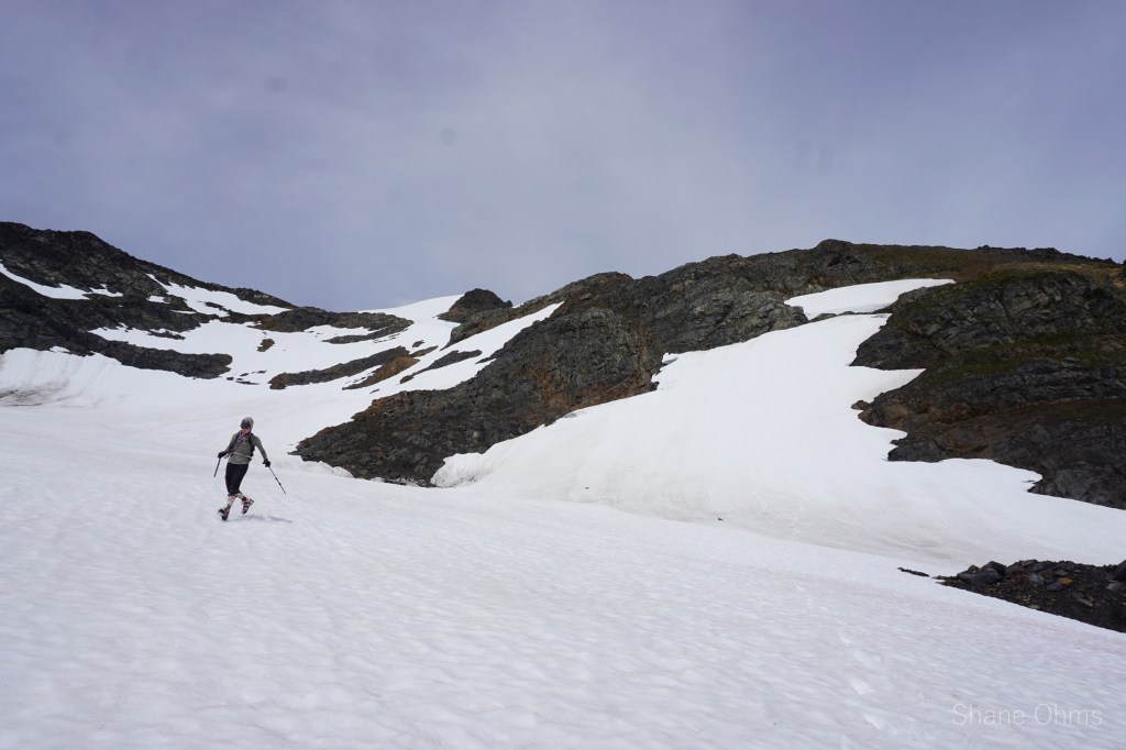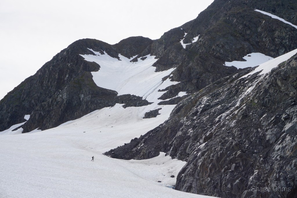 All the while we watched a dogsled operation go in circles down on the Punchbowl. Tourists would get dropped off helicopter after helicopter to achieve a dogsled ride in Alaska without the inconvenience of visiting in the winter/spring. Atop Highbush Sophie and I plotted our route for lowbush and resolved to say hi to the sled dog people on our return trip. We figured the folks working at the dogsled camp all summer might want to hear from us on routes to hike the peaks, and we were highly curious to ask them about the niche operation (and maybe bum a novelty sled ride if we happened to time a lull between their paying clients) 🙂