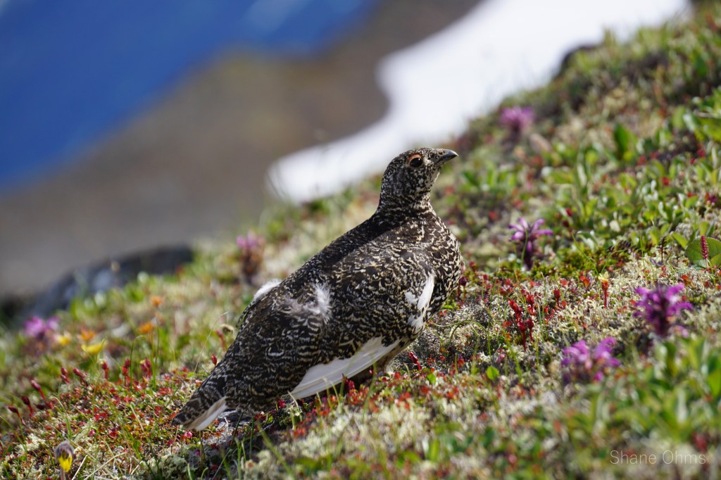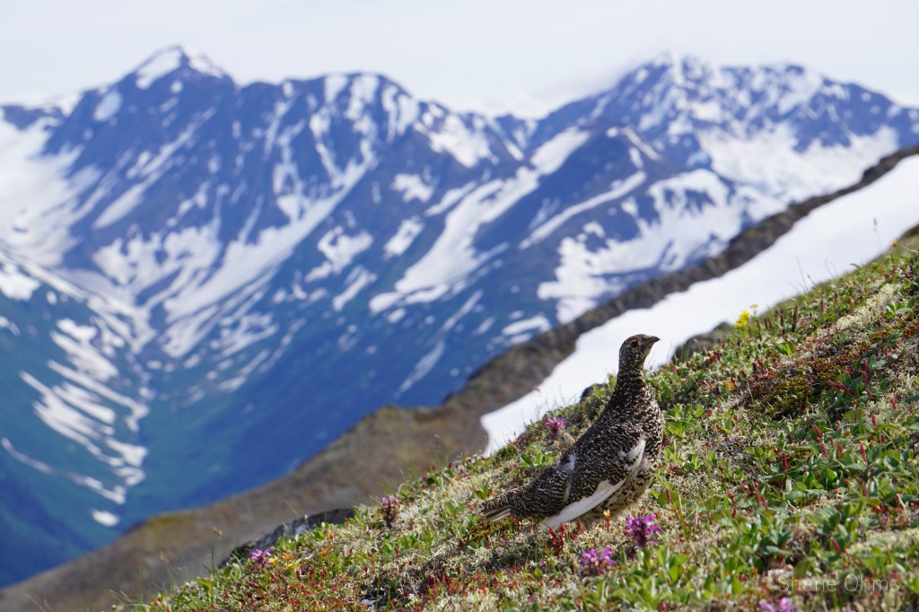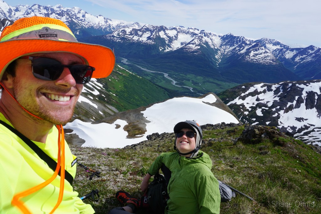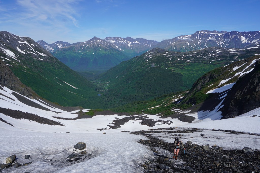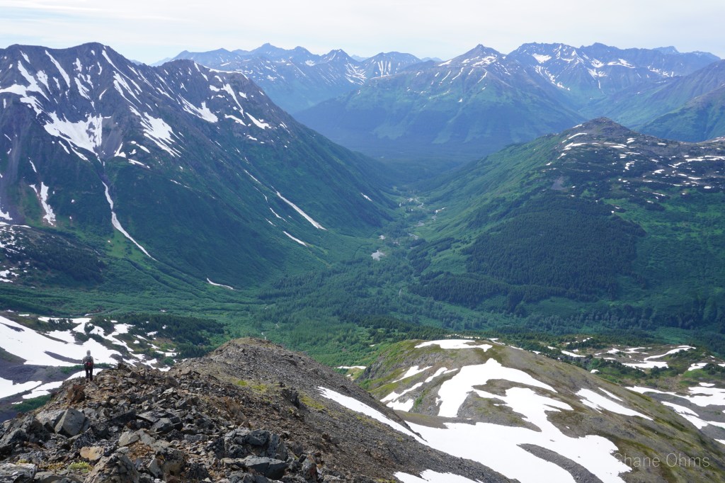 All the while we watched a dogsled operation go in circles down on the Punchbowl. Tourists would get dropped off helicopter after helicopter to achieve a dogsled ride in Alaska without the inconvenience of visiting in the winter/spring. Atop Highbush Sophie and I plotted our route for lowbush and resolved to say hi to the sled dog people on our return trip. We figured the folks working at the dogsled camp all summer might want to hear from us on routes to hike the peaks, and we were highly curious to ask them about the niche operation (and maybe bum a novelty sled ride if we happened to time a lull between their paying clients) 🙂