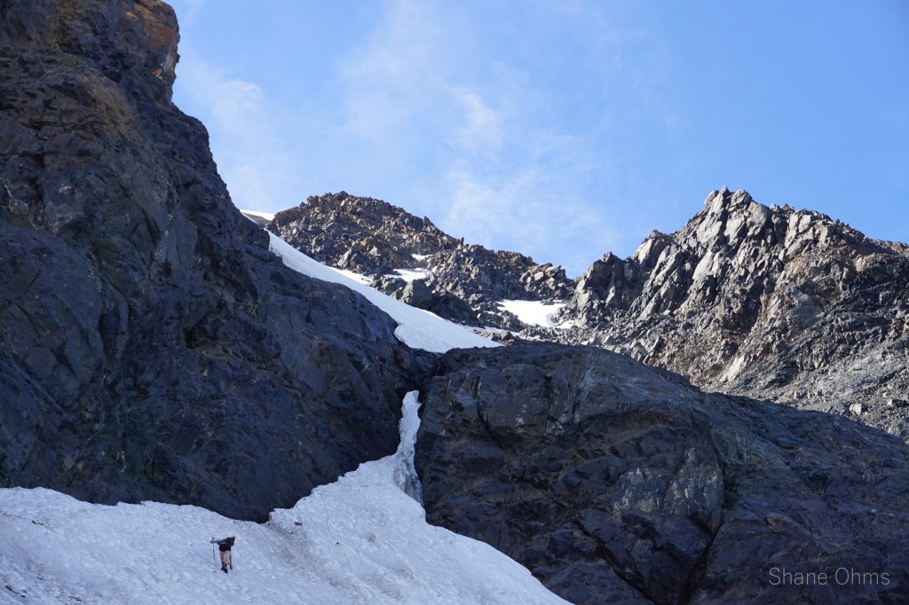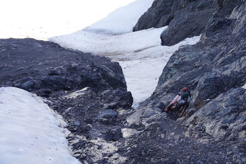Climbing Lowbush’s extra wide north ridge (more of a face to me) was simple. A nice, easy walk-up with superb views. For the descent, we took the east ridge down to the Punchbowl Glacier and chartered course for the dogsled people. A boisterous dialogue with the camp people, however, would not be taking place on this fine afternoon: enter “ass hat”.