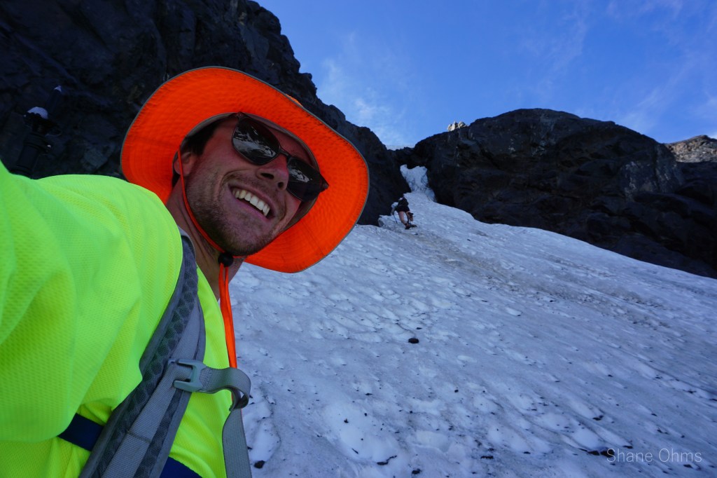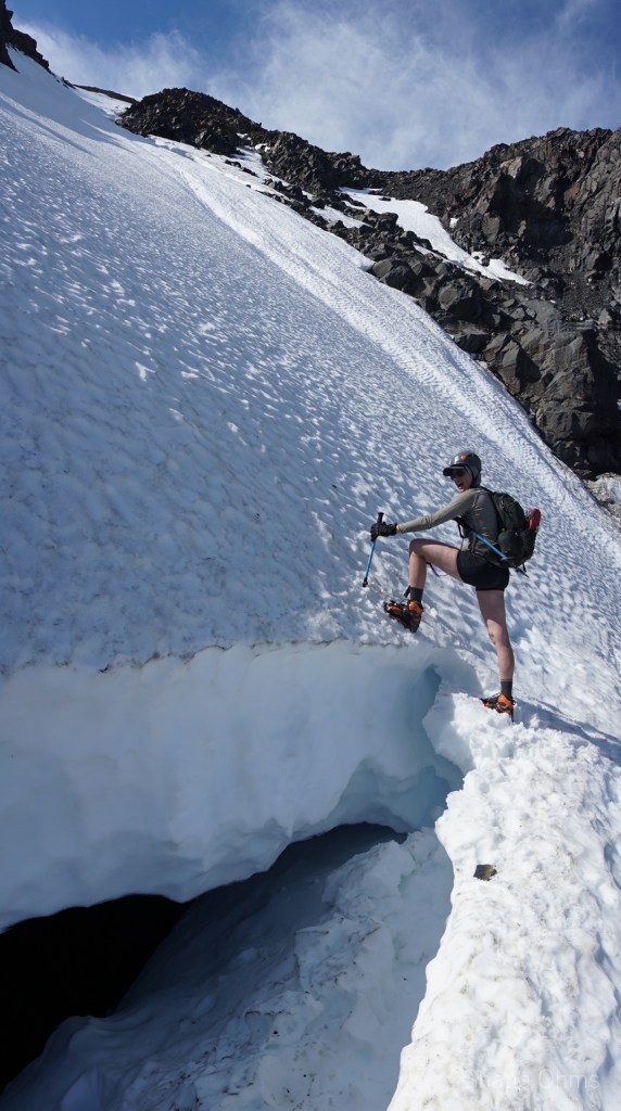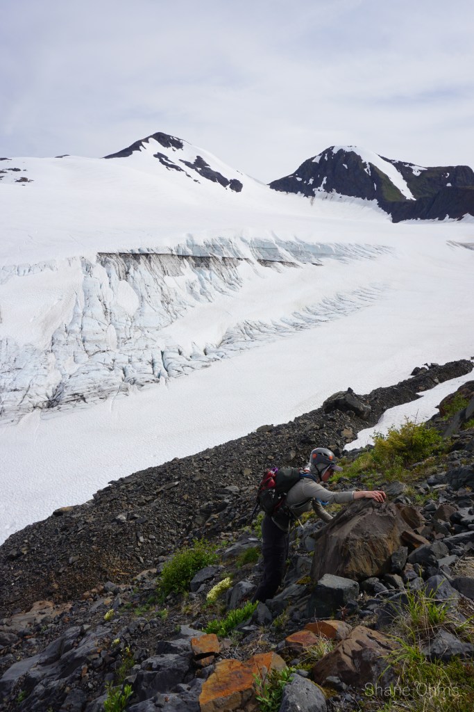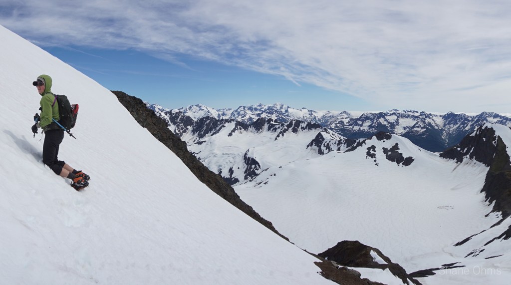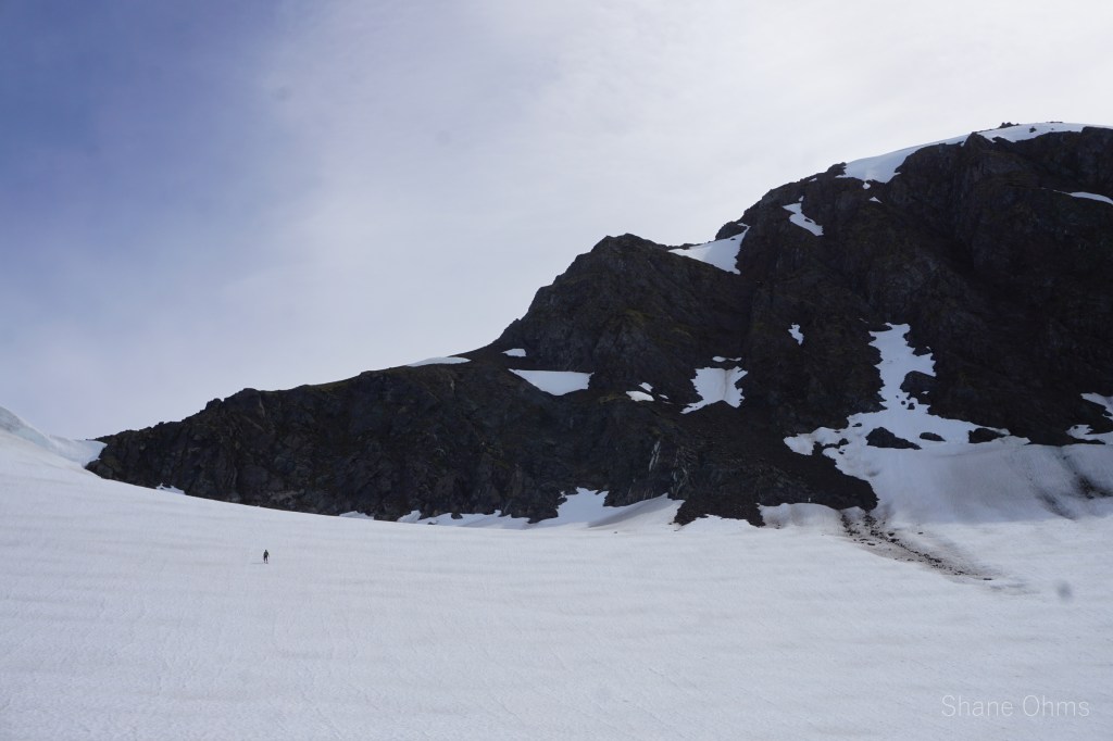 What???! I relayed the message to Sophie. Since fruitful conversation wasn’t going to be possible for as long as ass hat was around camp, we agreed there was no sense lingering. Now, I understand that the portable sheds and dogsleds are your possessions, your legitimate private property, which I have sincere respect for. But to have the audacity to infer that Punchbowl Glacier is your private property… well that’s quite fitting for the name he will forever bear in my memory: “ass hat”. Since ass hat does not own Punchbowl Glacier any more or less than we do, we walked straight through the dog mushing course, not that footsteps would change the glacier surface any, but just to be deliberate in not doing what he wanted us to do. And also because the dog mushing course happened to be in the way of our next peak: Lingon Peak which we were now beelining for.