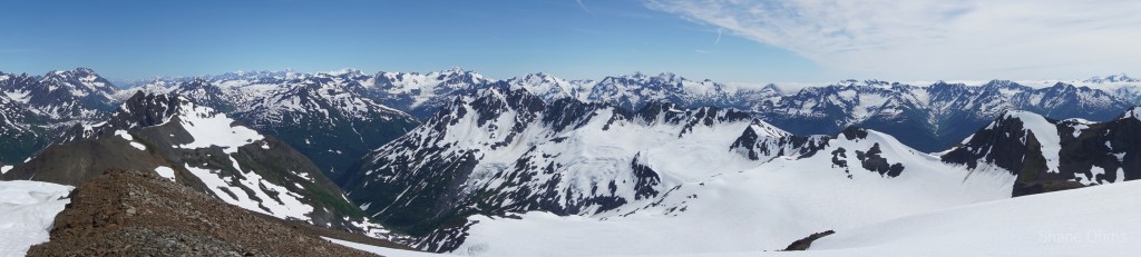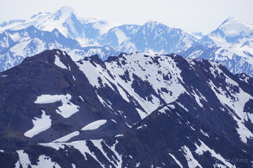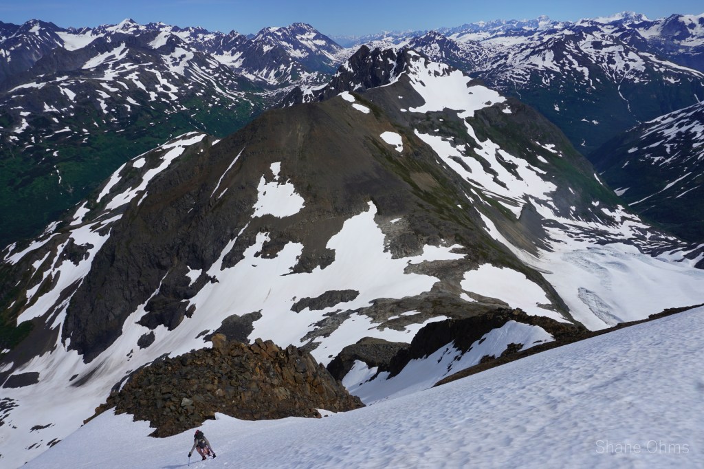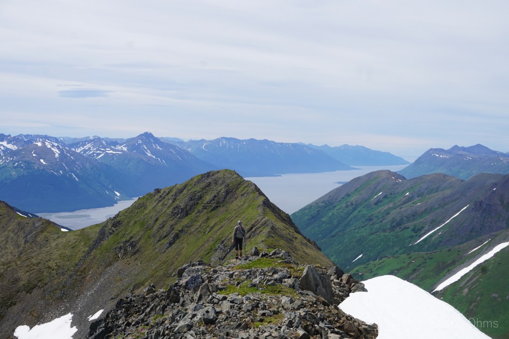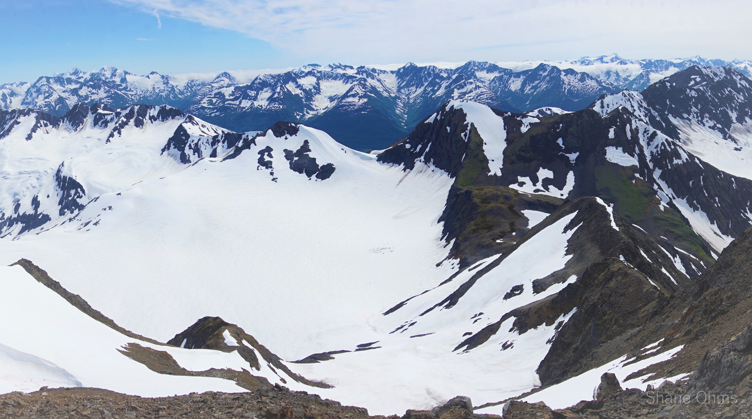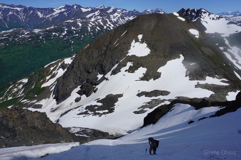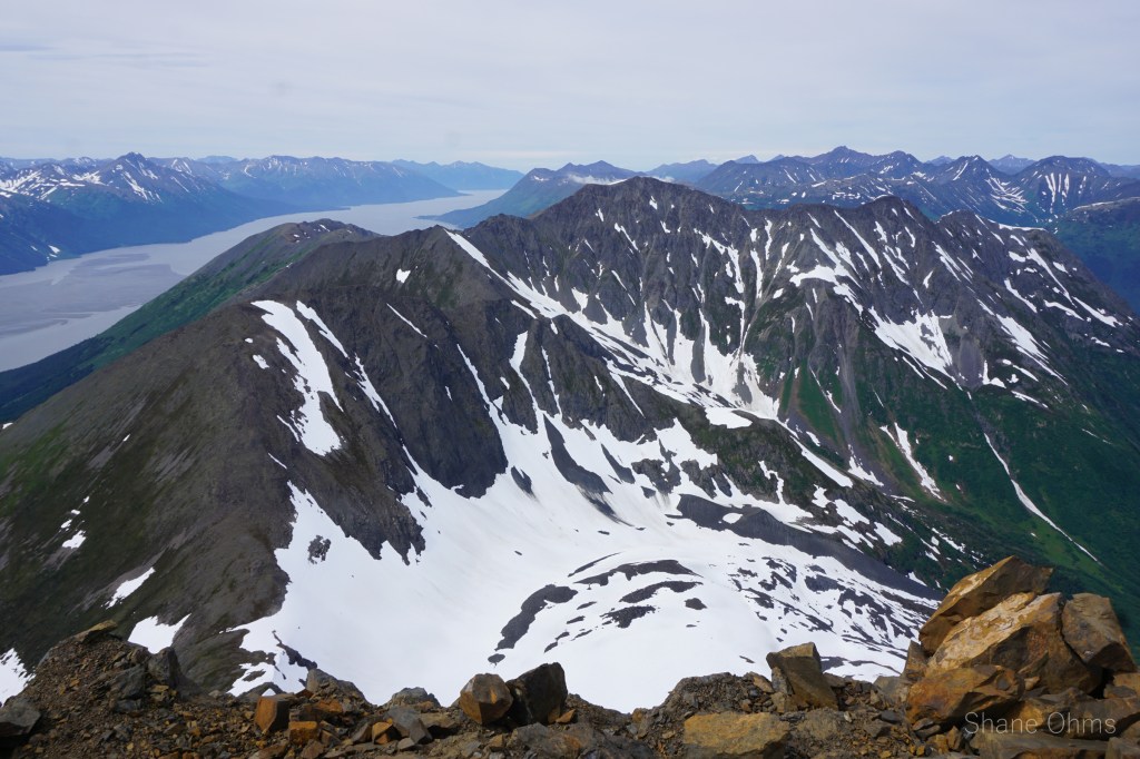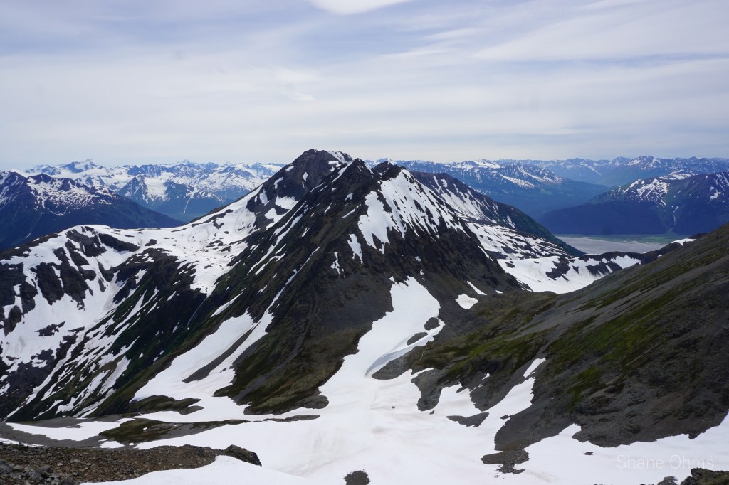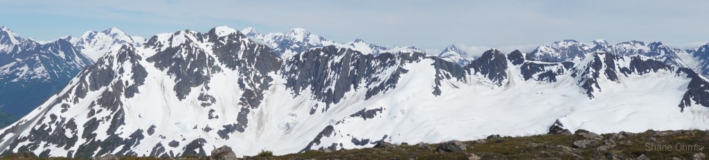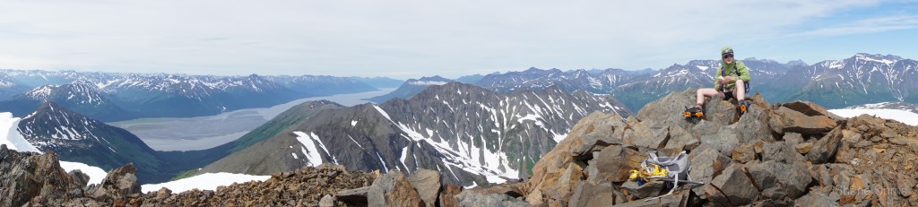 The snow line went splendidly. Wonderful 50 degree snow, a little hard, not yet softened by the sun. But that beats the other extreme: slushy and unsupportive. Sophie was nursing a broken toe at the time so I got all the first kicks in crampons. From the top of our snow line, the summit was a little walk away, and earned at 1pm. Sophie logged into the registrar, I took lots of great pictures. The Turnagain Arm was splayed out and the views in all directions, of the countless Chugach Mountains, were pristine. I’m glad we didn’t do this one on a day with poor visibility.