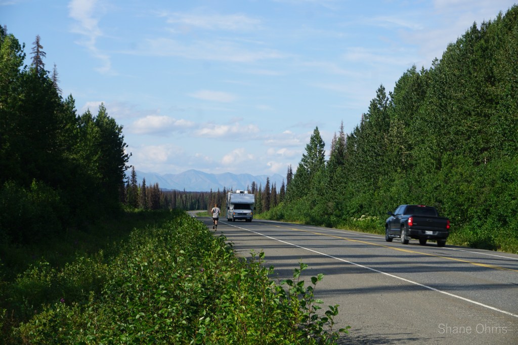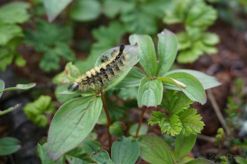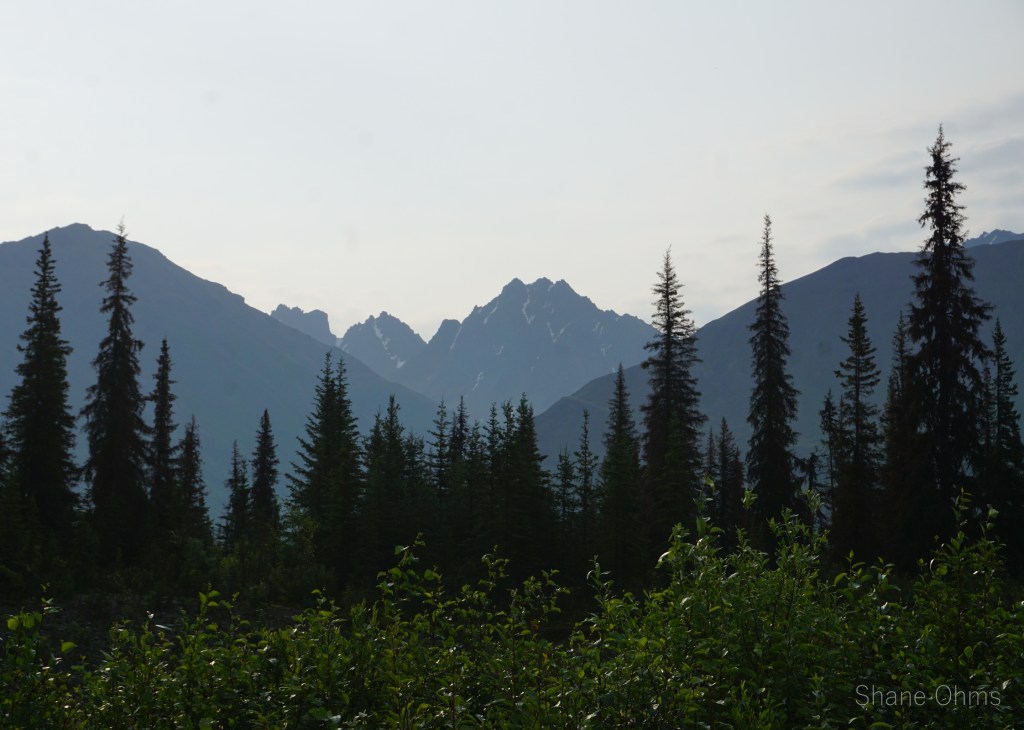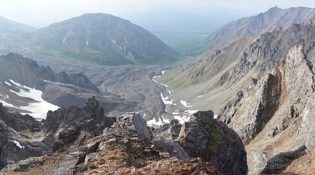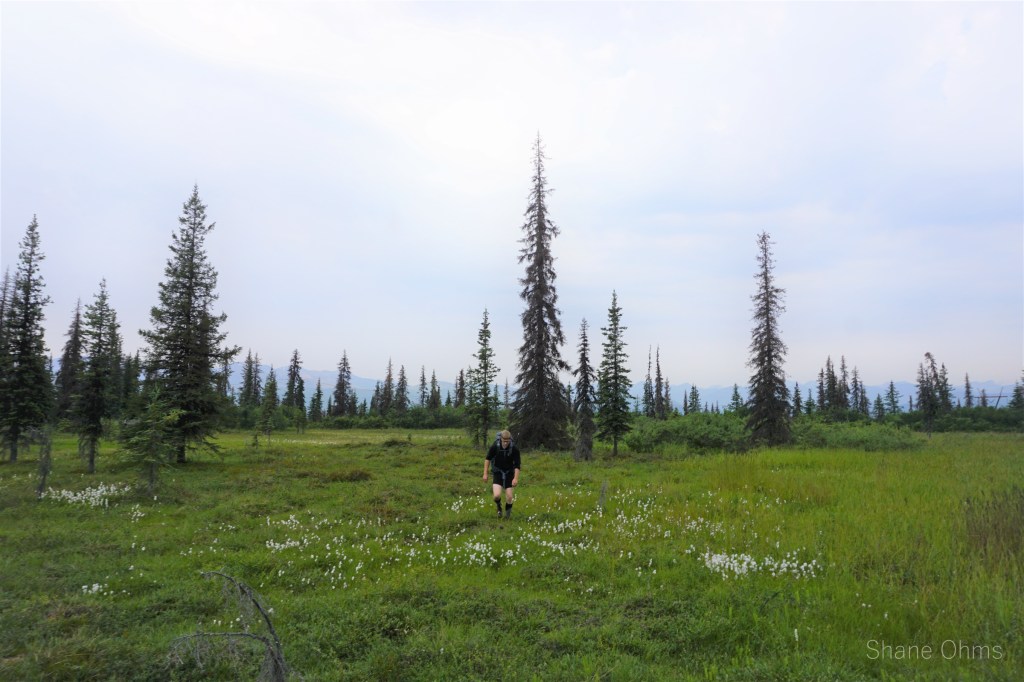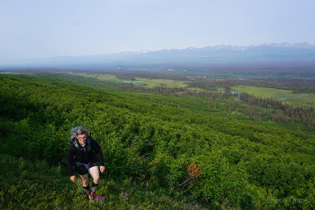 Early in the morning, Rowland Powers and I drove south to Cantwell where our trip would begin at some pullout about 2 miles NW of Antimony Peak. Our trajectory was schwacking due east into the rock glacier north of Antimony. The schwacking was substantially harder than I had estimated: so unpleasant, in fact, that it would ultimately lead us to plot an alternative exit just to avoid repeating it. Mosquitos and a HOT July sun weren’t helping any.