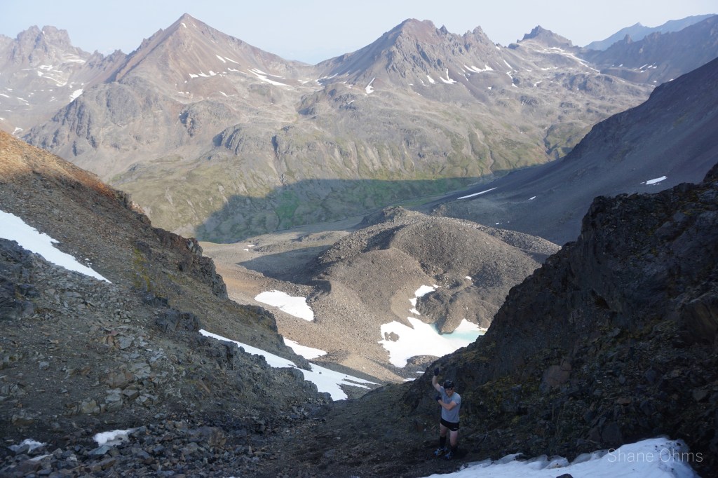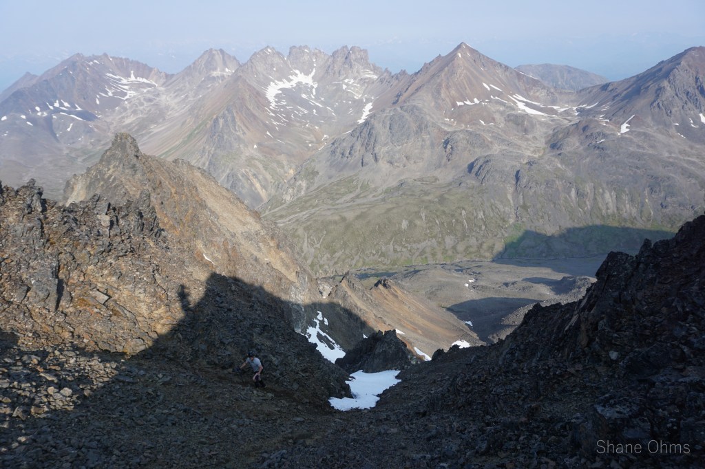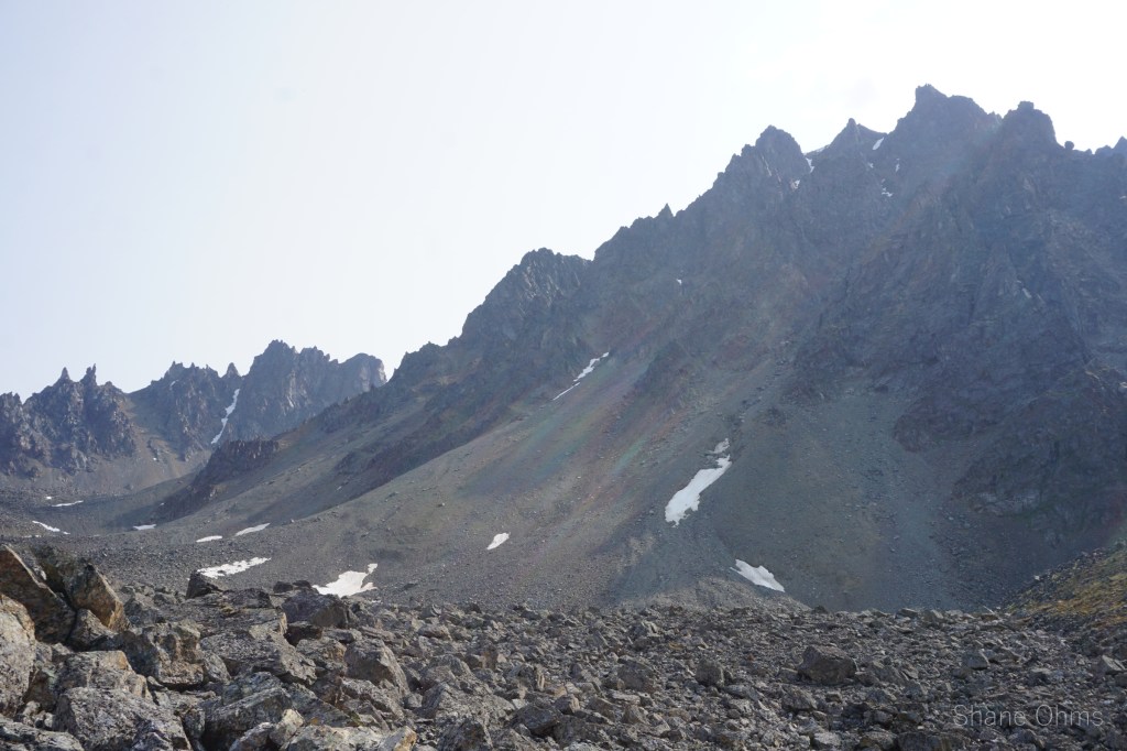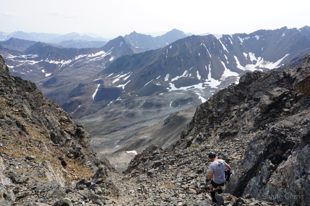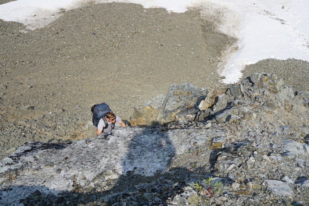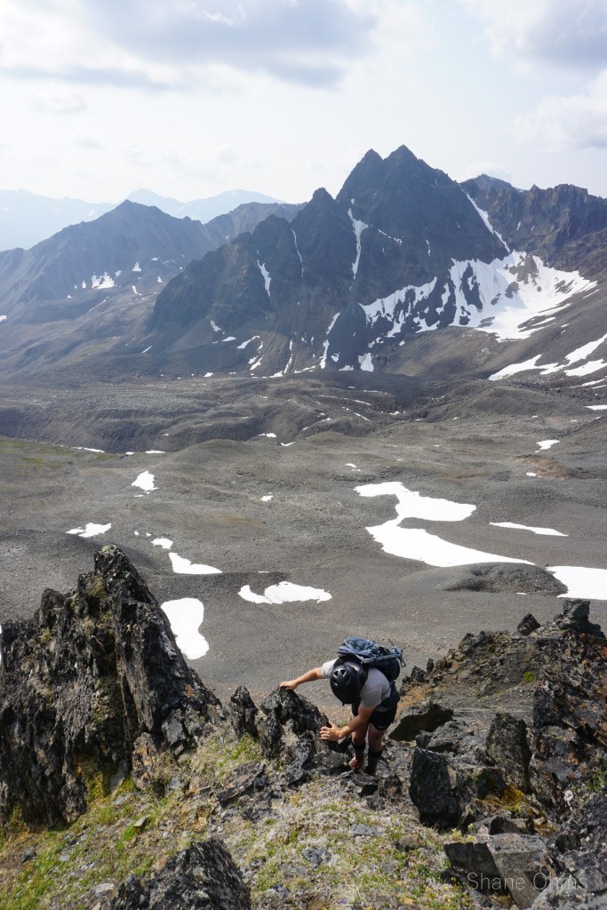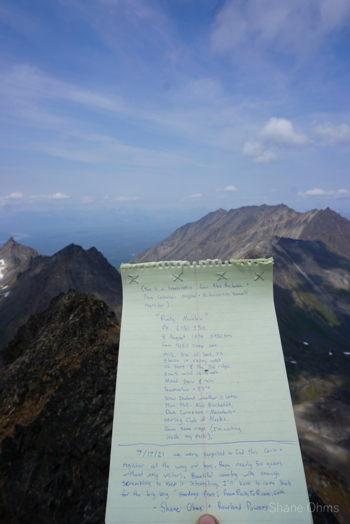 The Southwest ridge of Rusty Peak was pretty fun scrambling too. No more of a comment is needed. Rusty Peak would be the highest point of the whole weekend for us, and atop it, we found a summit carin with a rusty little capsule marking….. the August 1974 ascent by Alex Buchannon and Dave Connston! 47 years the summit sat between our two parties. We’d both climbed via the same ridge, so most notably from their registry was the use of the word “glacier” to describe the bowl in which the caribou sat. Standing up there after almost 50 years I can say this; you’d have to be pretty hardpressed to find any ice down there. All rock now. Sad. I transcribed their entry and added it to the registrar I’d brought for this peak. Our descent would be into the “glacier” valley, spooking caribou, and filling water from a little tarn.