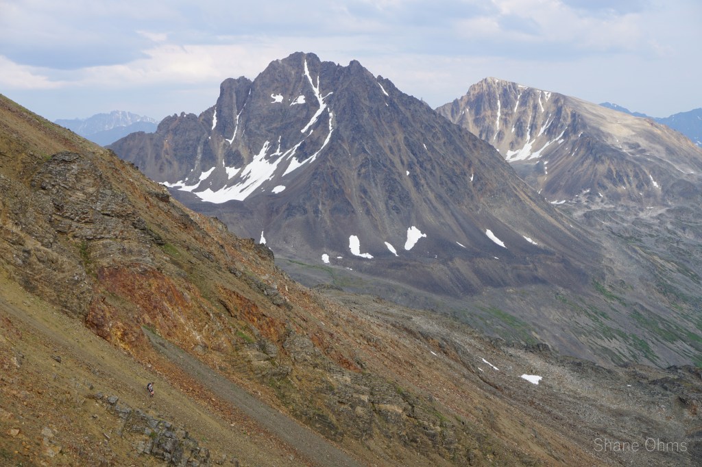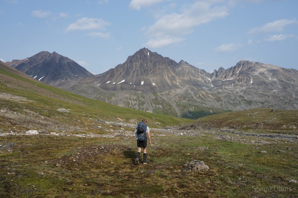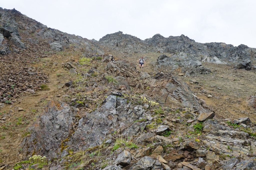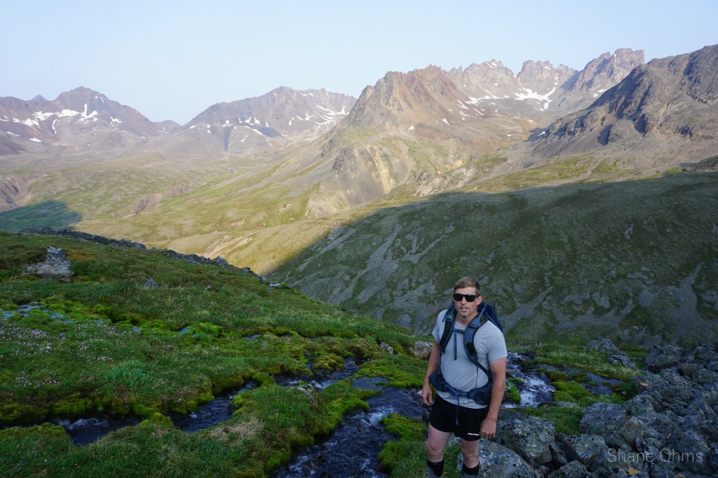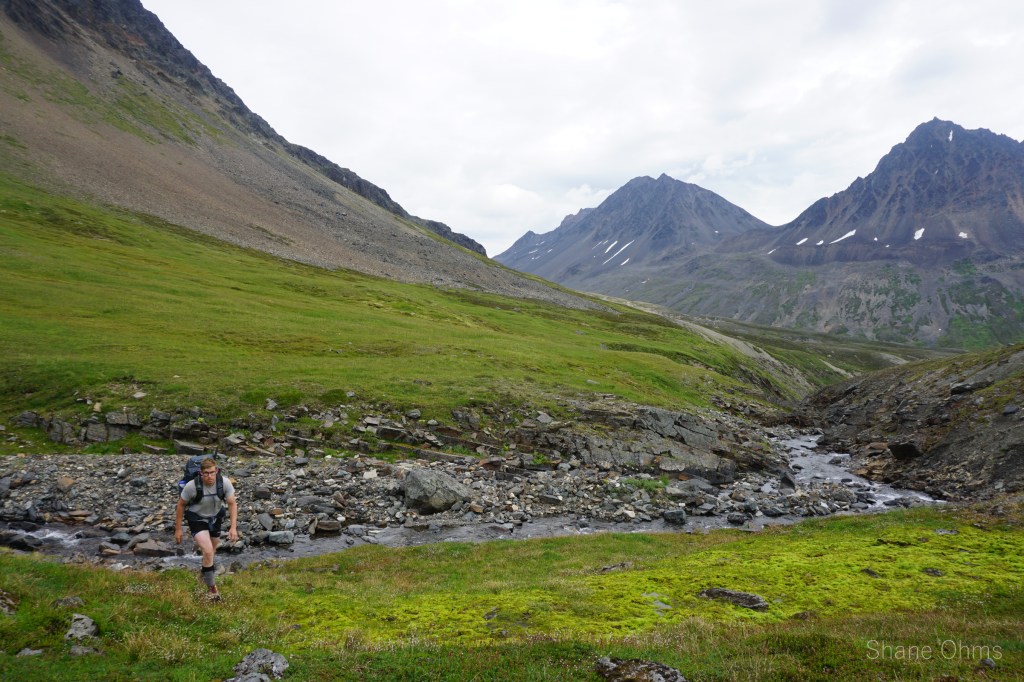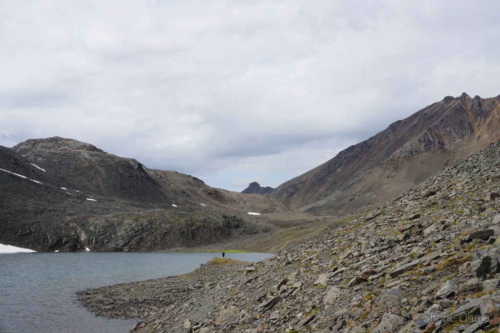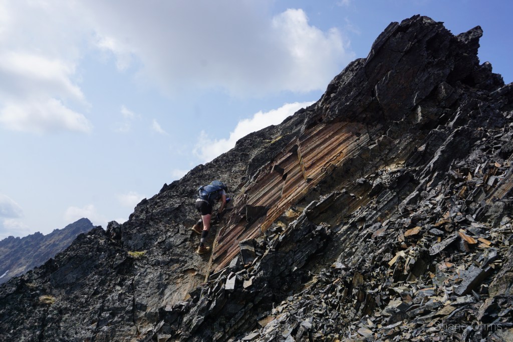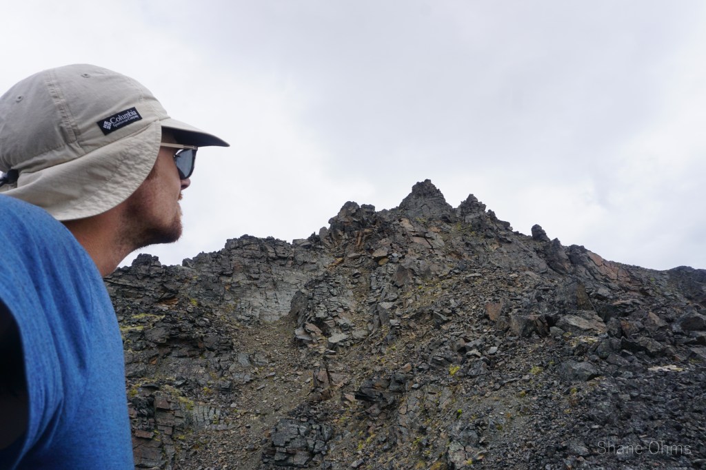 The Southwest ridge of Rusty Peak was pretty fun scrambling too. No more of a comment is needed. Rusty Peak would be the highest point of the whole weekend for us, and atop it, we found a summit carin with a rusty little capsule marking….. the August 1974 ascent by Alex Buchannon and Dave Connston! 47 years the summit sat between our two parties. We’d both climbed via the same ridge, so most notably from their registry was the use of the word “glacier” to describe the bowl in which the caribou sat. Standing up there after almost 50 years I can say this; you’d have to be pretty hardpressed to find any ice down there. All rock now. Sad. I transcribed their entry and added it to the registrar I’d brought for this peak. Our descent would be into the “glacier” valley, spooking caribou, and filling water from a little tarn.