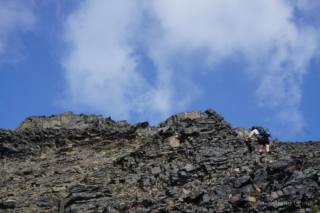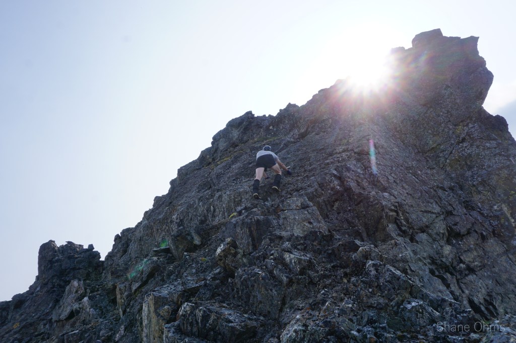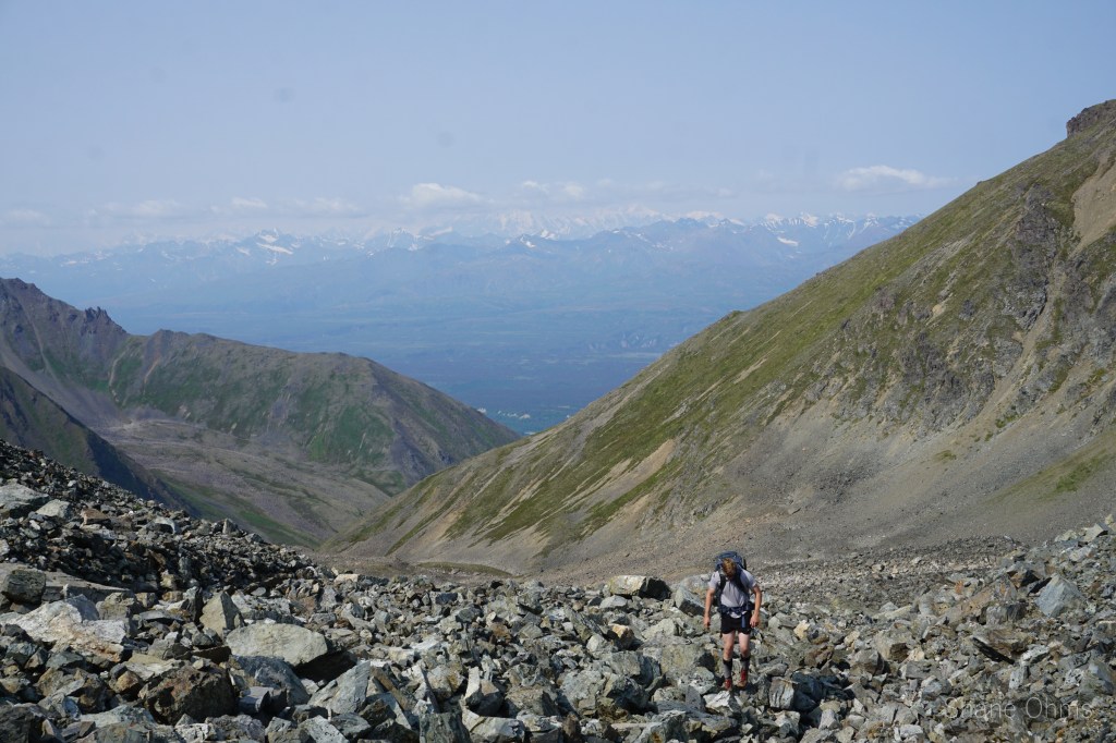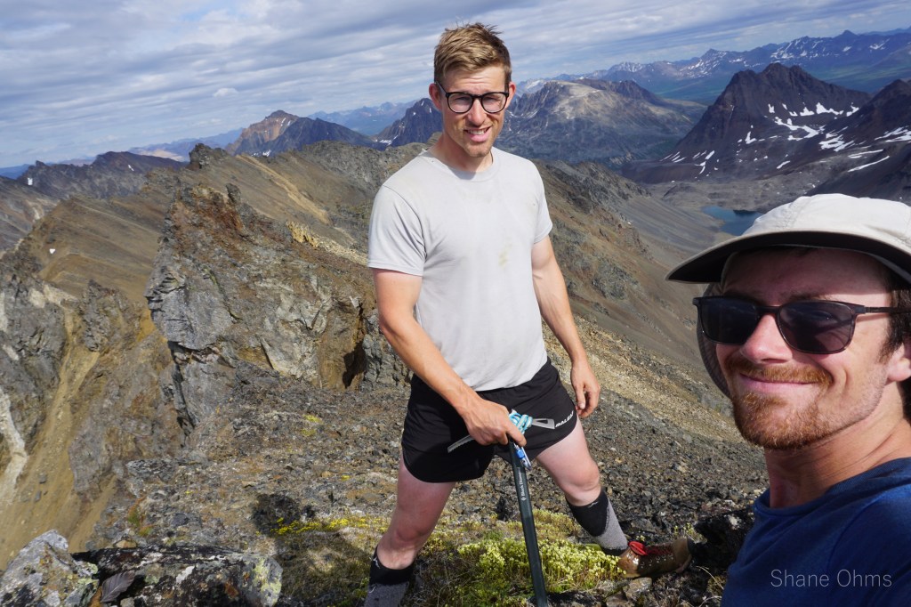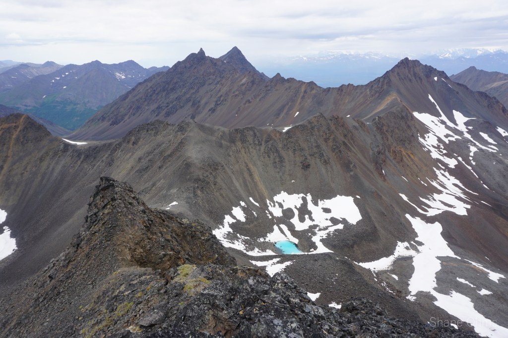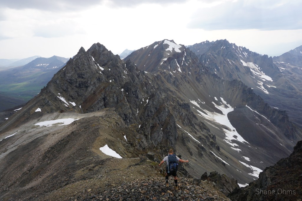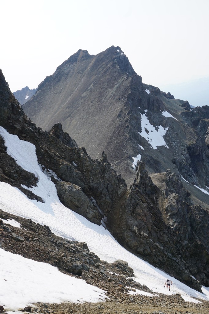 The Southwest ridge of Rusty Peak was pretty fun scrambling too. No more of a comment is needed. Rusty Peak would be the highest point of the whole weekend for us, and atop it, we found a summit carin with a rusty little capsule marking….. the August 1974 ascent by Alex Buchannon and Dave Connston! 47 years the summit sat between our two parties. We’d both climbed via the same ridge, so most notably from their registry was the use of the word “glacier” to describe the bowl in which the caribou sat. Standing up there after almost 50 years I can say this; you’d have to be pretty hardpressed to find any ice down there. All rock now. Sad. I transcribed their entry and added it to the registrar I’d brought for this peak. Our descent would be into the “glacier” valley, spooking caribou, and filling water from a little tarn.