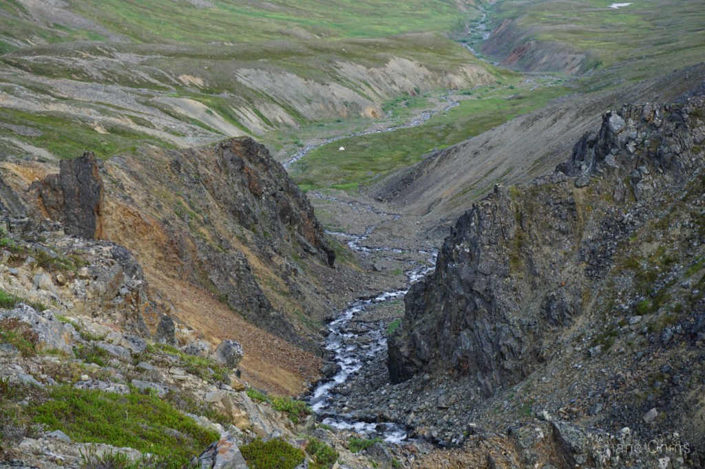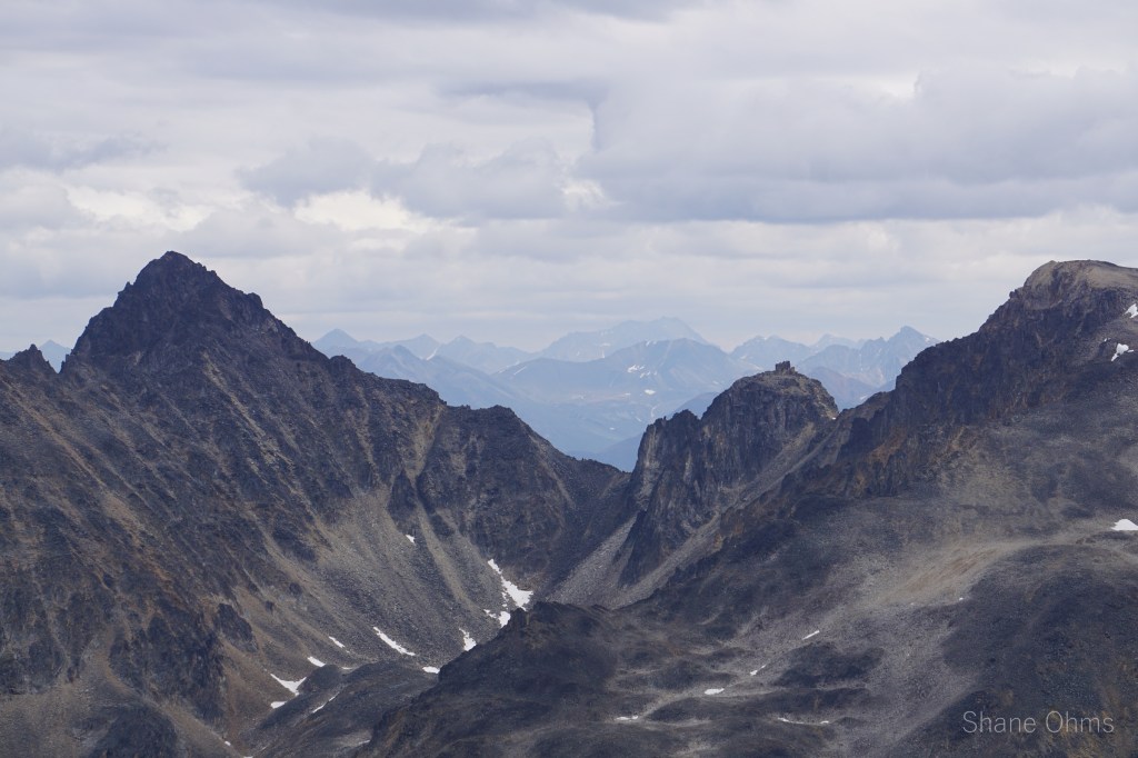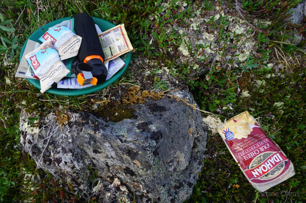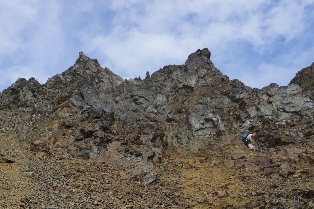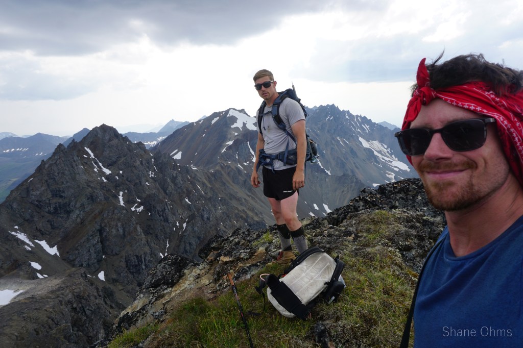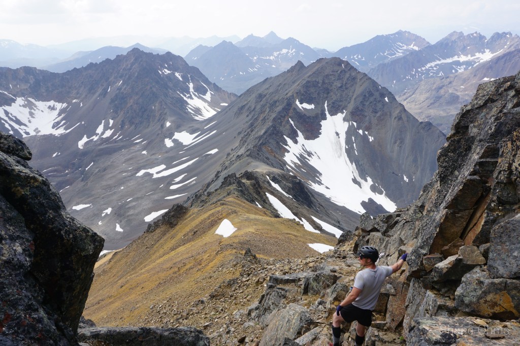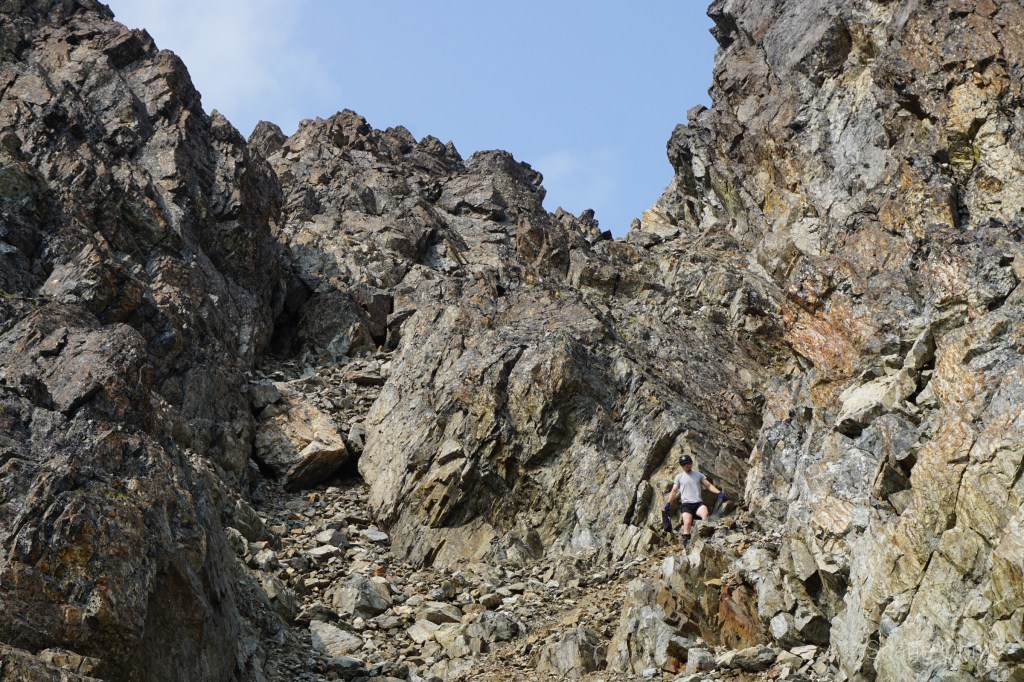 The Southwest ridge of Rusty Peak was pretty fun scrambling too. No more of a comment is needed. Rusty Peak would be the highest point of the whole weekend for us, and atop it, we found a summit carin with a rusty little capsule marking….. the August 1974 ascent by Alex Buchannon and Dave Connston! 47 years the summit sat between our two parties. We’d both climbed via the same ridge, so most notably from their registry was the use of the word “glacier” to describe the bowl in which the caribou sat. Standing up there after almost 50 years I can say this; you’d have to be pretty hardpressed to find any ice down there. All rock now. Sad. I transcribed their entry and added it to the registrar I’d brought for this peak. Our descent would be into the “glacier” valley, spooking caribou, and filling water from a little tarn.