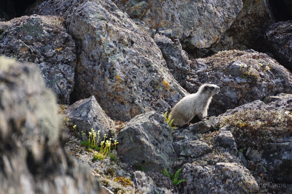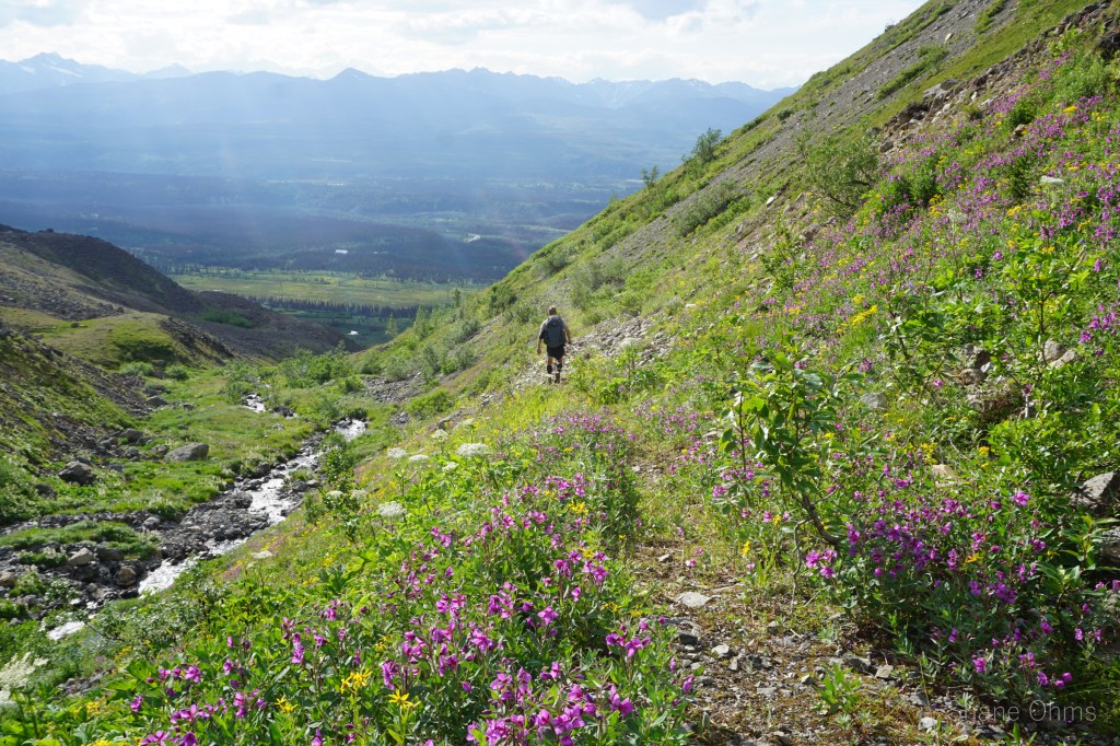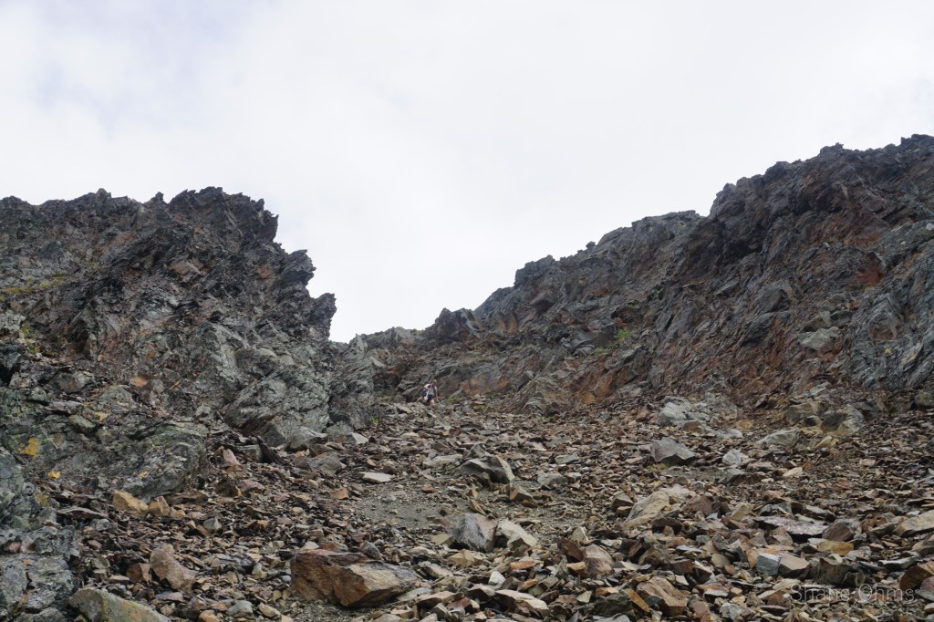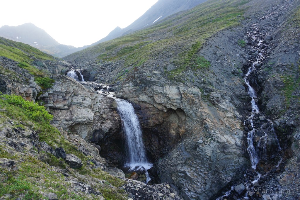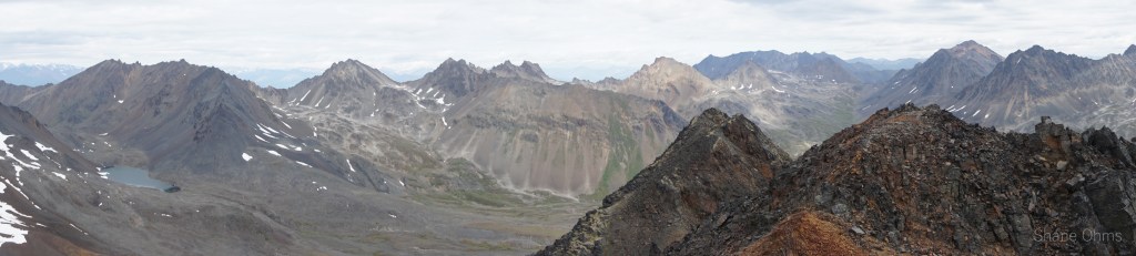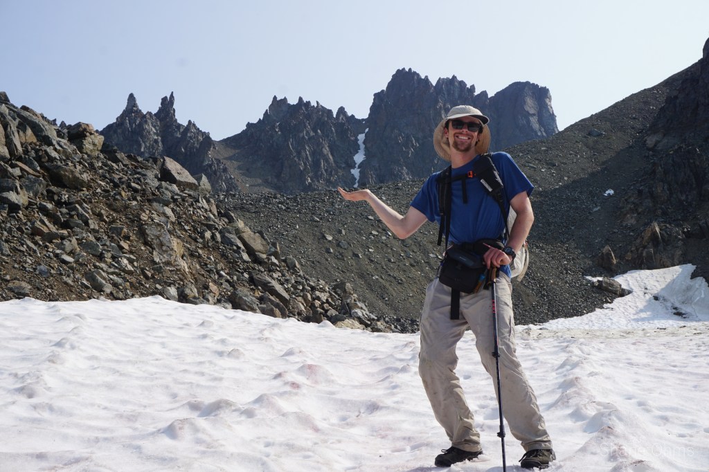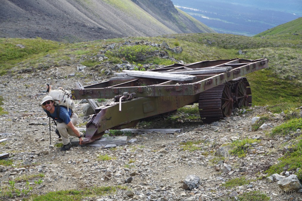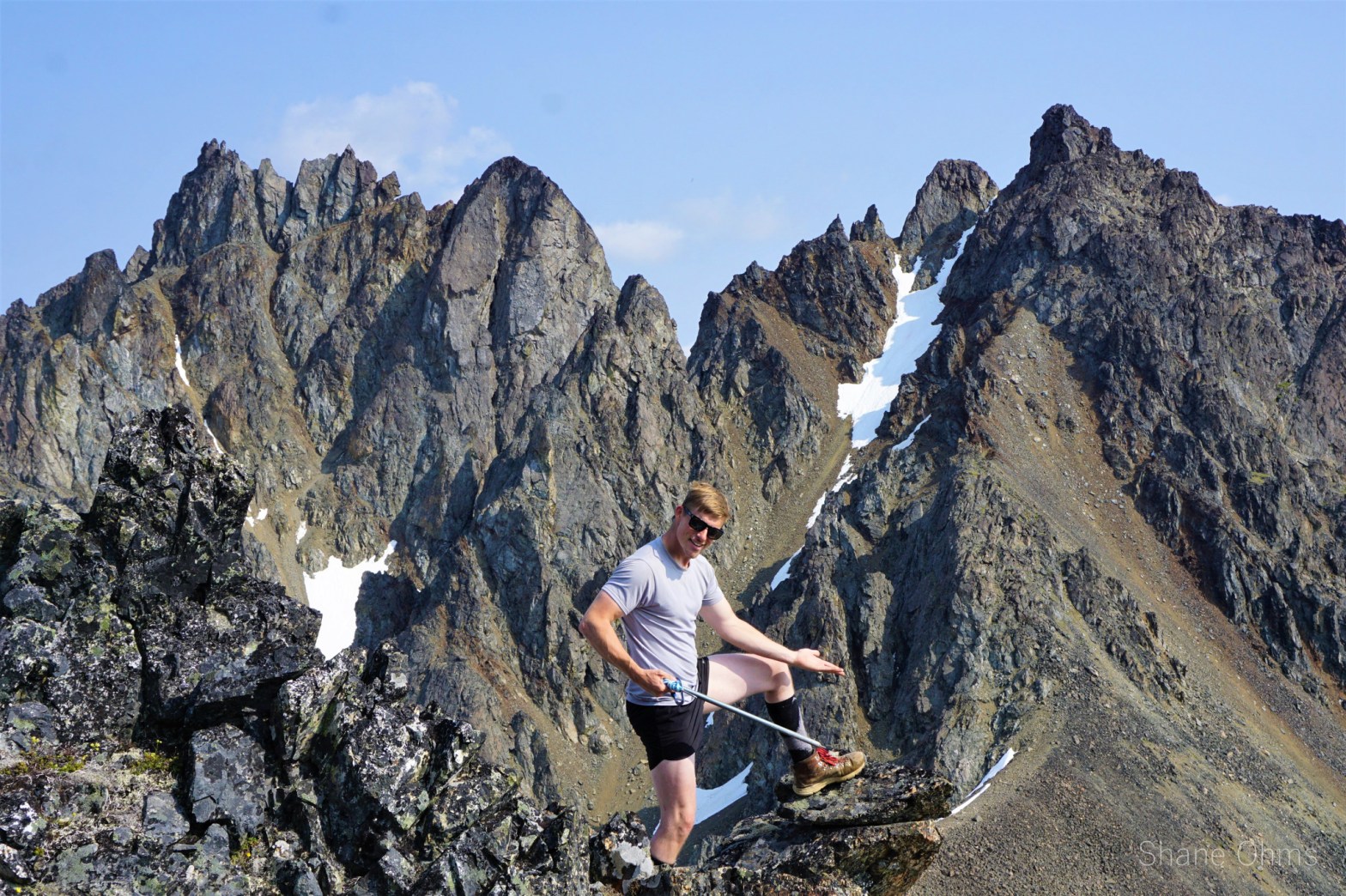 The Southwest ridge of Rusty Peak was pretty fun scrambling too. No more of a comment is needed. Rusty Peak would be the highest point of the whole weekend for us, and atop it, we found a summit carin with a rusty little capsule marking….. the August 1974 ascent by Alex Buchannon and Dave Connston! 47 years the summit sat between our two parties. We’d both climbed via the same ridge, so most notably from their registry was the use of the word “glacier” to describe the bowl in which the caribou sat. Standing up there after almost 50 years I can say this; you’d have to be pretty hardpressed to find any ice down there. All rock now. Sad. I transcribed their entry and added it to the registrar I’d brought for this peak. Our descent would be into the “glacier” valley, spooking caribou, and filling water from a little tarn.