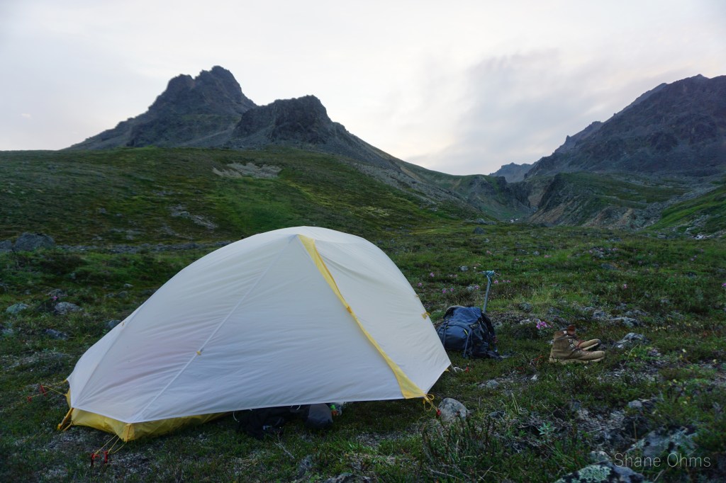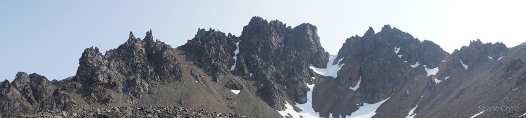 After grabbing our packs, we went down to the headwaters of Honolulu Creek, setting up camp at the end of the Southern Spire’s east ridge. We’d done 2500′ with packs and another 1000′ without, 7 miles total. It had been a light first day.