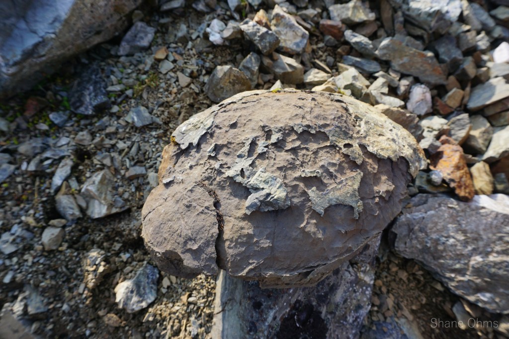 And finally our ridgewalking loop ended with us on Astatine Peak and looking down on our campsite. Again, no prior ascent signs found. On the descent of Astatine I found a clam shell fossil, maybe I’m not so crazy supposing that rock from before was a turtle fossil.