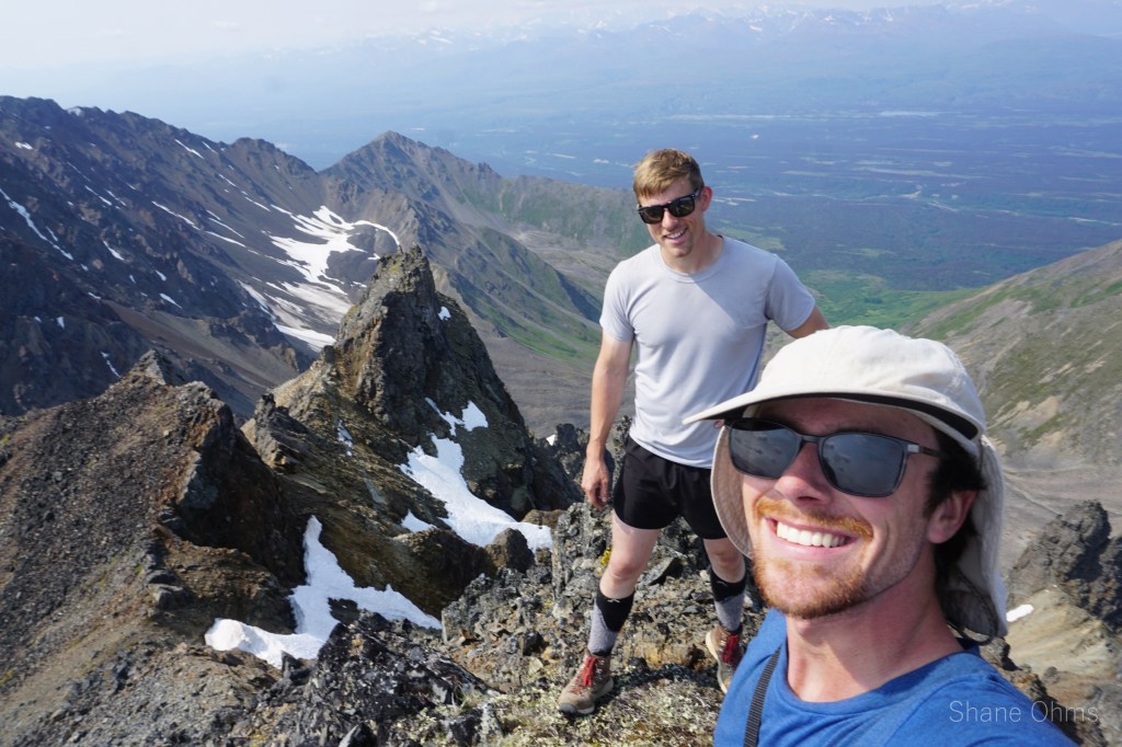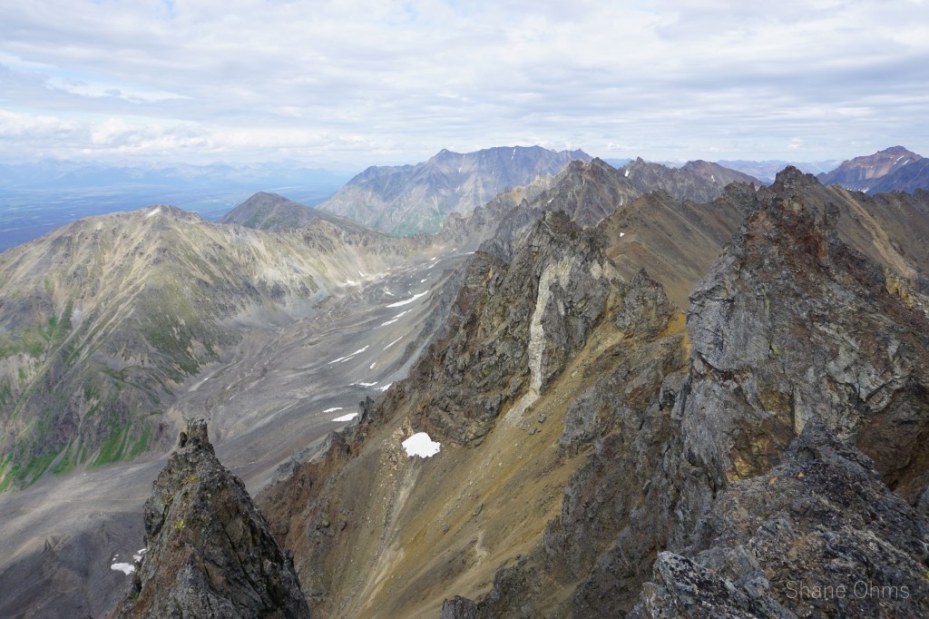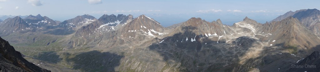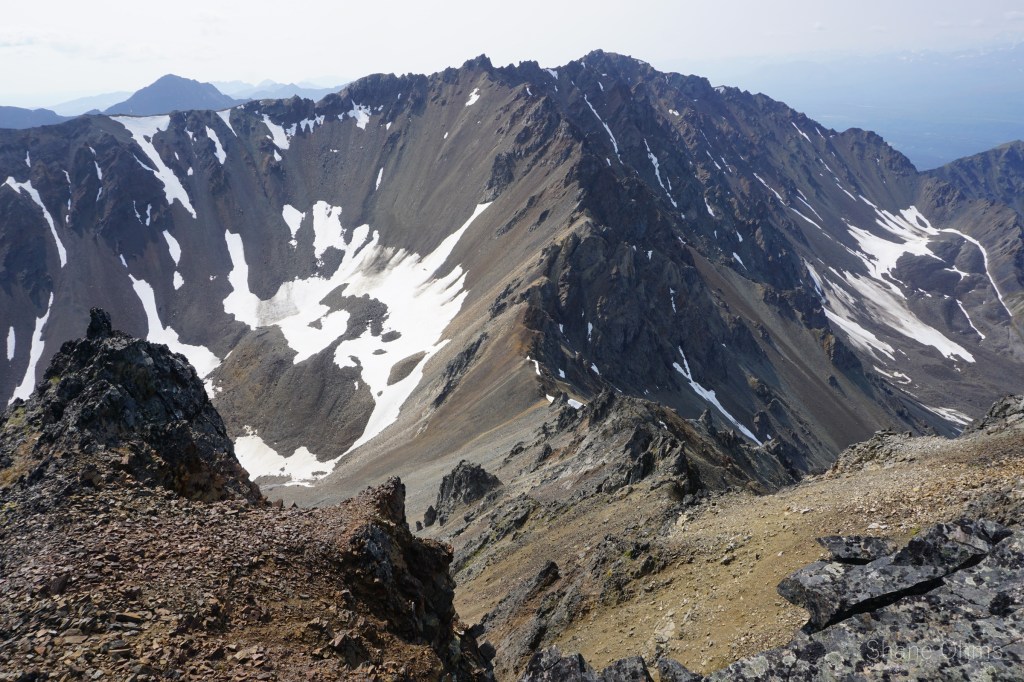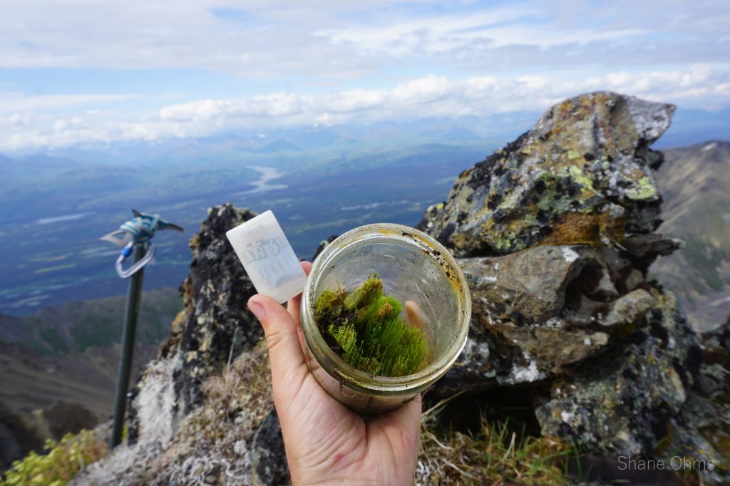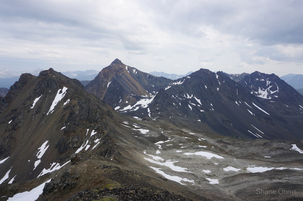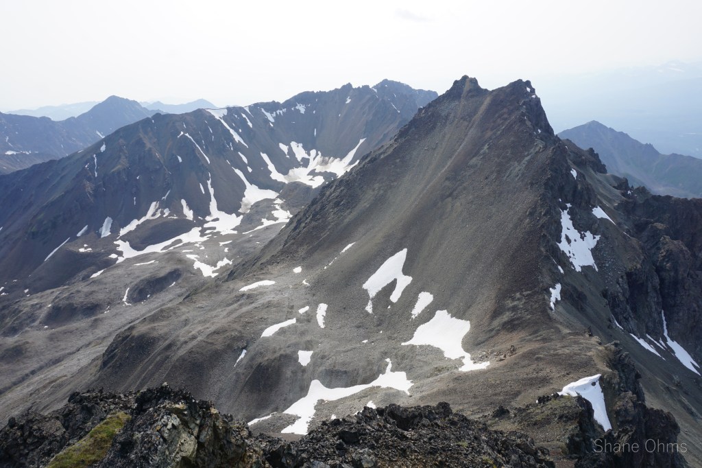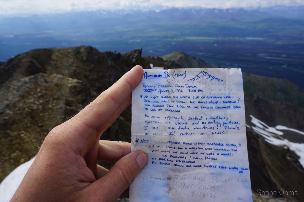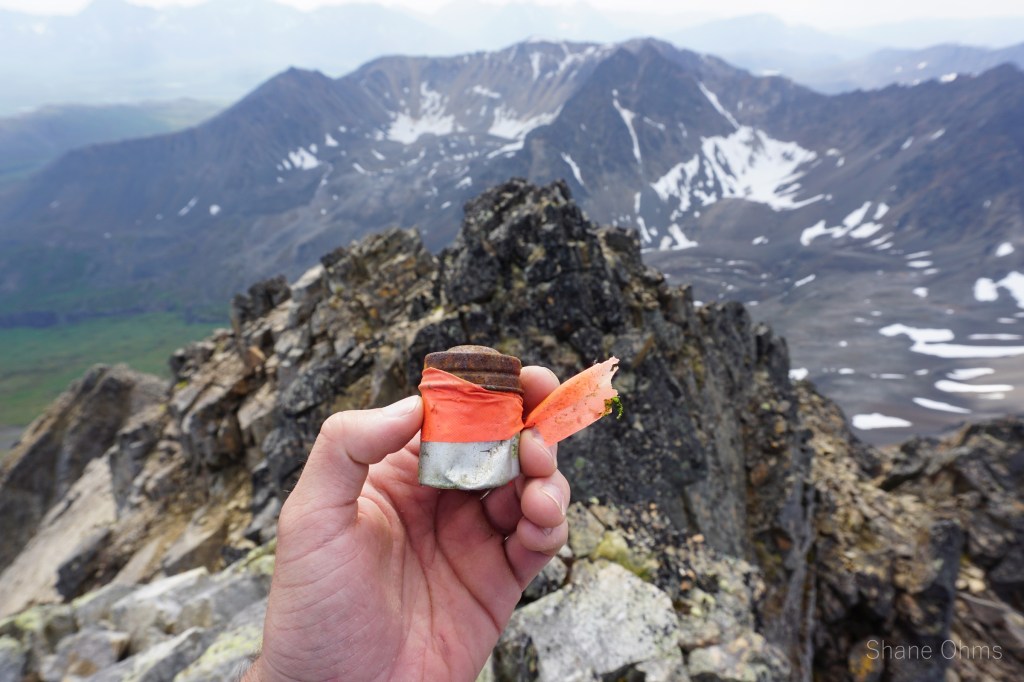 At the top, we found the oddest summit registrar(s). I wouldn’t have been able to tell if not for the note, but a matchbox, pencil, and peanuts in a glass jar, growing life other than peanuts. The note is of an August 7th 1996 Richard Baranow and Wendy Sanem finding the odd jar left by an earlier summit party containing names Ed Reichert and Chuck Patton (exact first ascent date unknown). Richard and Wendy’s registrar calls this peak Antimony Peak. I call this peak Bismuth Peak because Antimony Peak is already the name of the surveyor point printed on topo maps and located due west. I suppose “Antimony Propper” might be the name that sticks (in similar style to Turnagain Pass’ Tincan Peak and Tincan Propper), but in the halls of my temporal memory, it will be Bismuth Peak.