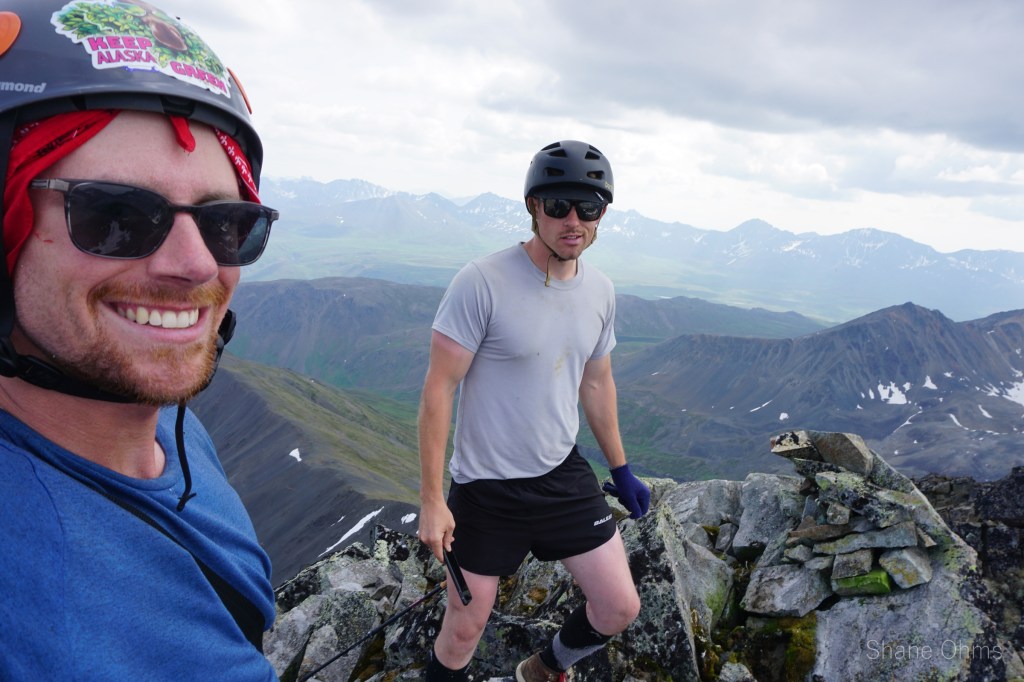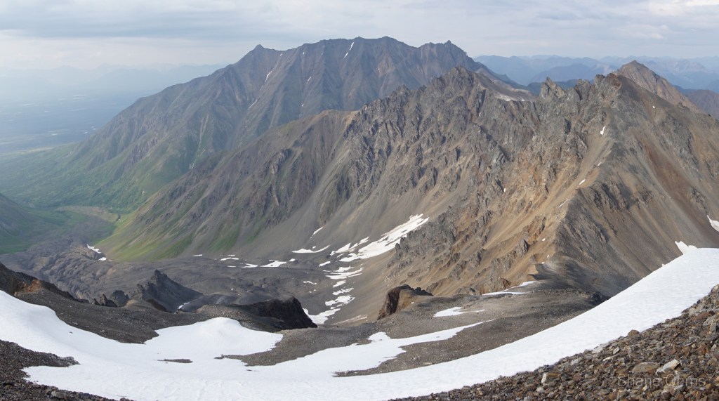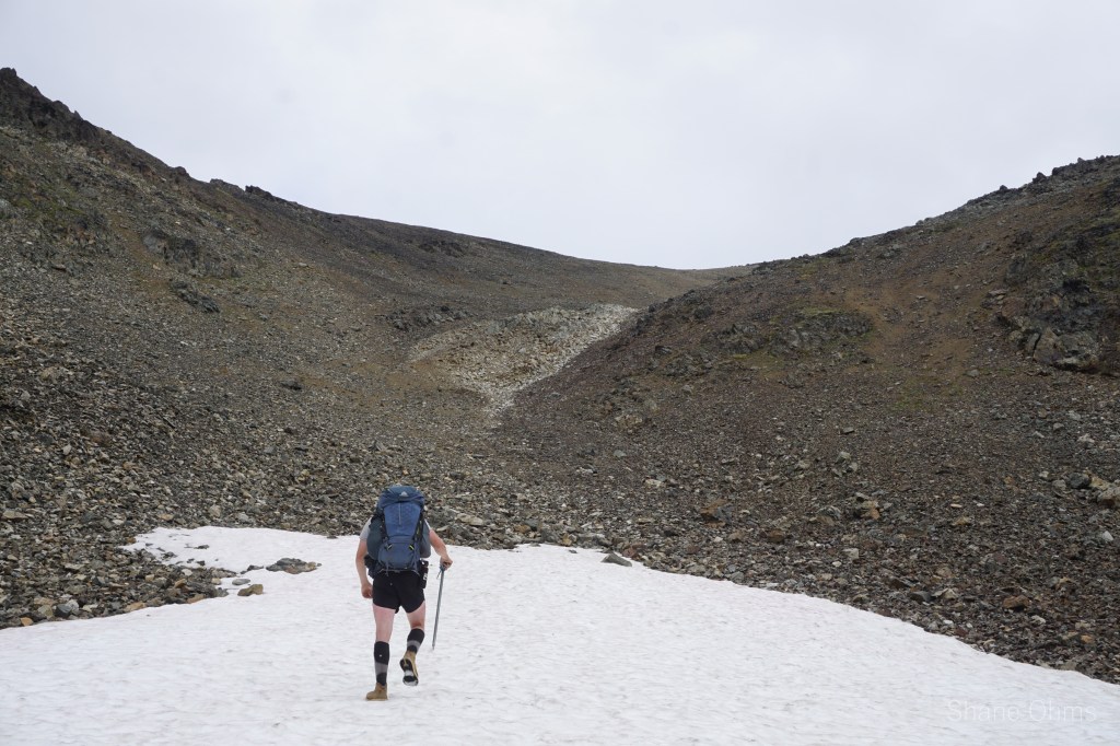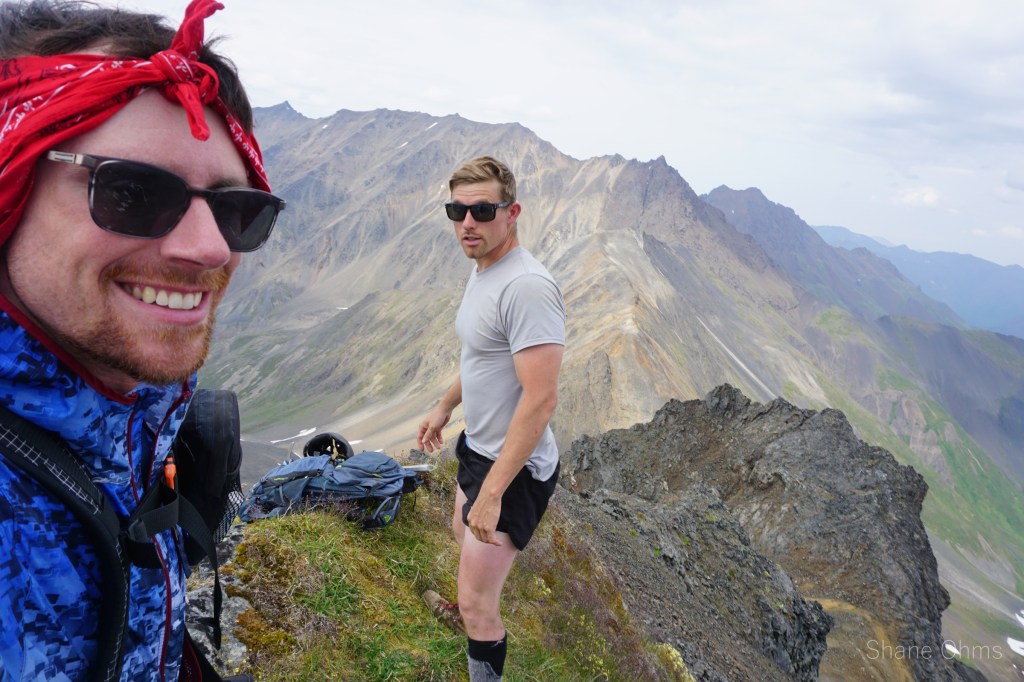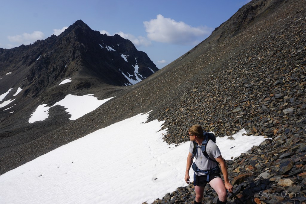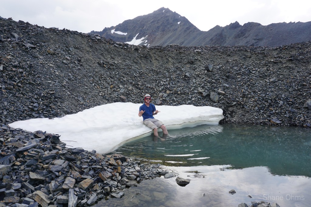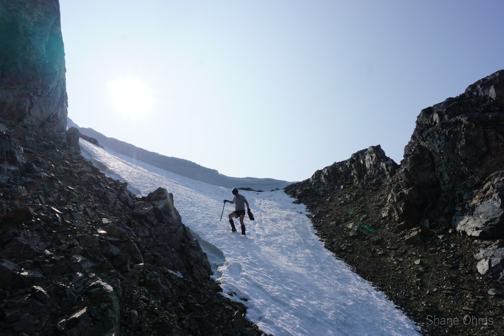 The steepness was nice. Clean and shaded. Not mentally taxing, but far from boring. It was a wonderful line though, and the only section of the trip lending itself to the Rowland’s ice axe. Unfortunately, couloir hungry Rowland wouldn’t get many couloirs besides this one in Summer 2021. Nor did 2021 have any packrafting or 9000’ers: my two biggest regrets of 2021. I’ll do better in 2022. Anyhow, thats enough reflection for now; from the top of Tennessine Peak we looked over to a southeastern point of similar contour line. We believe we were higher, but they seem close in height. No sign of prior ascent found. We reversed our route, then topped off our water in a meltpool between Tennessine and Oganesson. Water was a hot commodity out here in July.