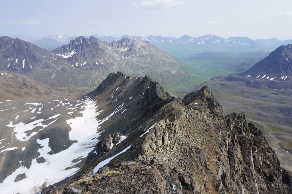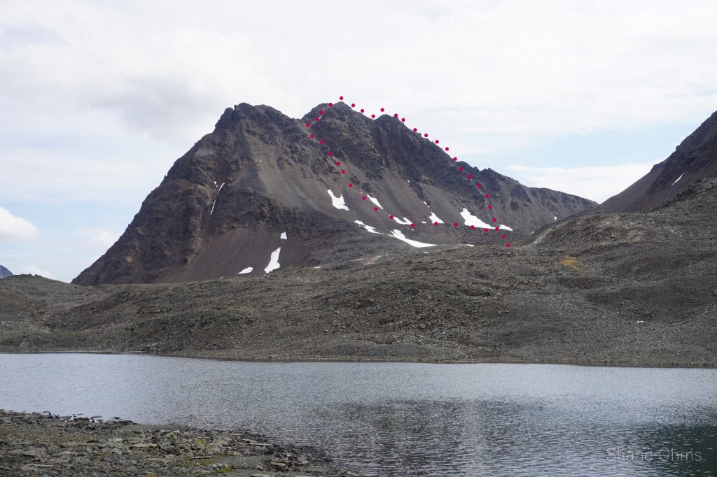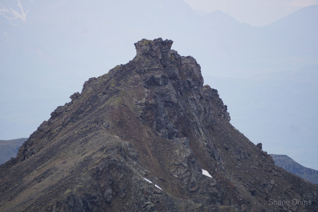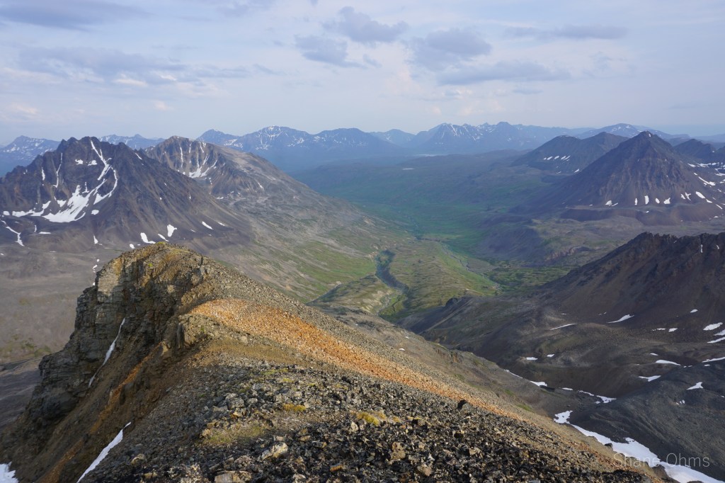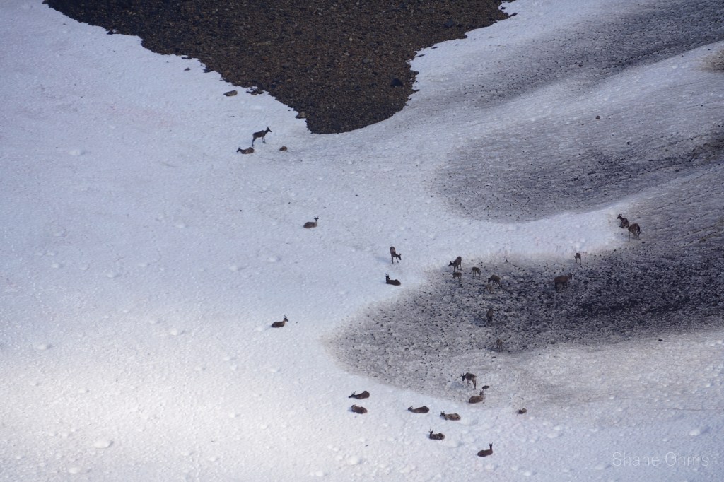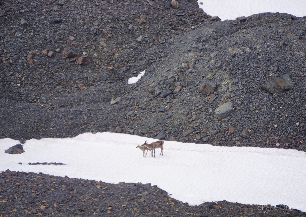 For Oganesson we took the SE face. This SE face and the following descent of it’s East Ridge, would be the most scrambly terrain we covered on the trip. But we shimmed and clawed, hee’d and haw’ed and made it atop. Again, no prior ascents found. Below the peak some caribou were enjoying the coolness of the snow in a high bowl. Unfortunatley, we would be kicking them out upon the eventual descent of Rusty Peak.