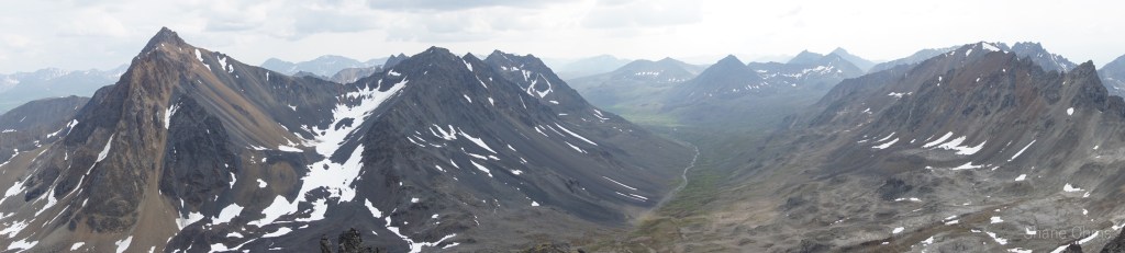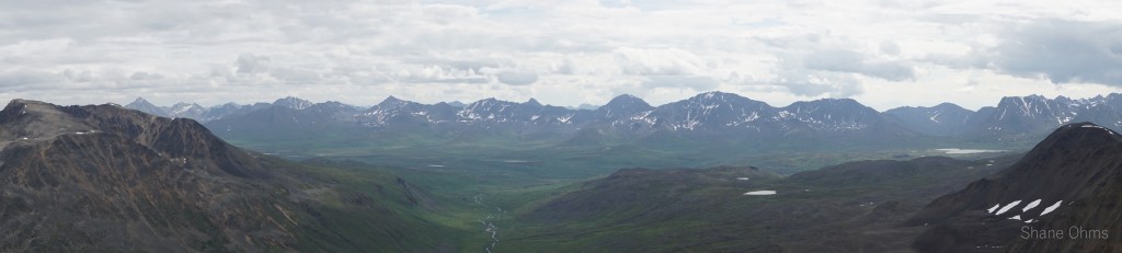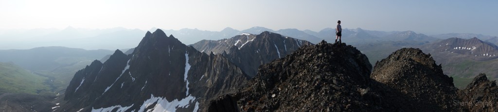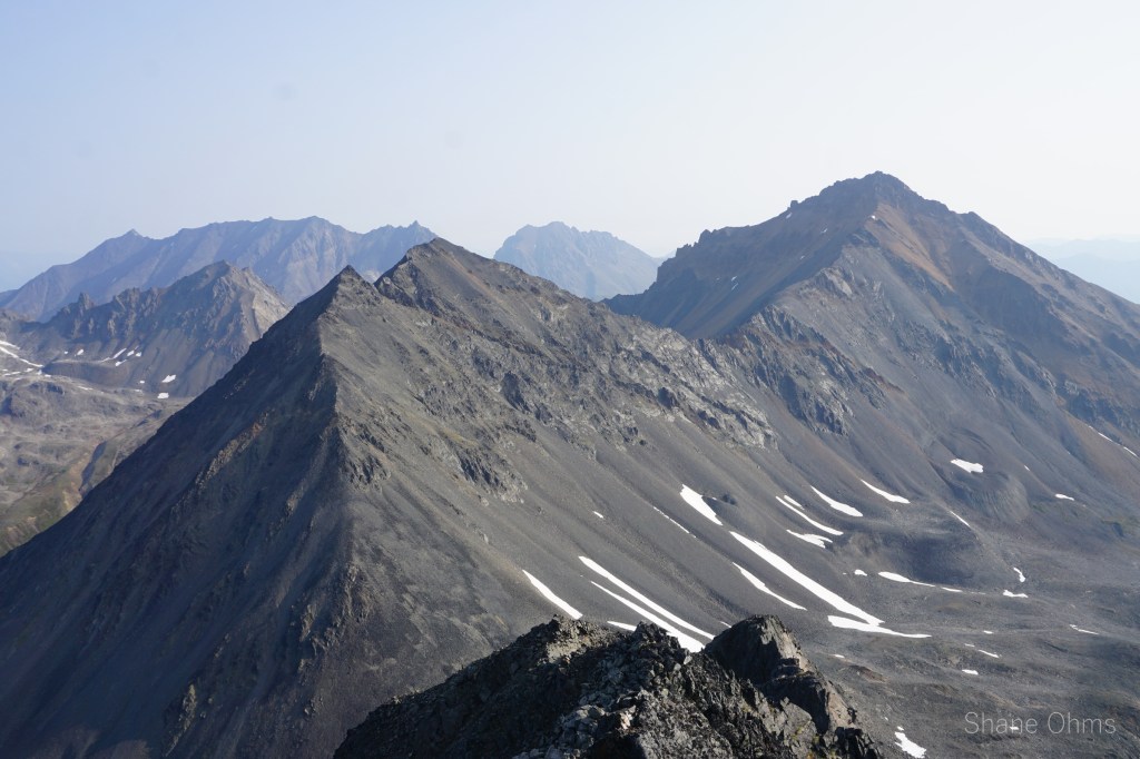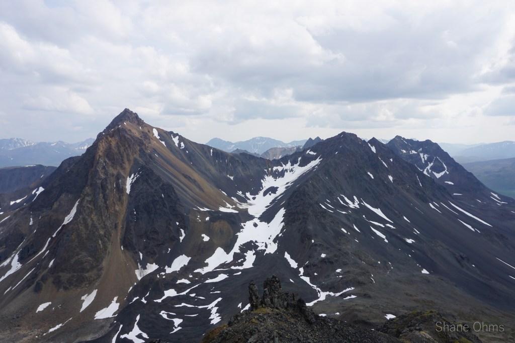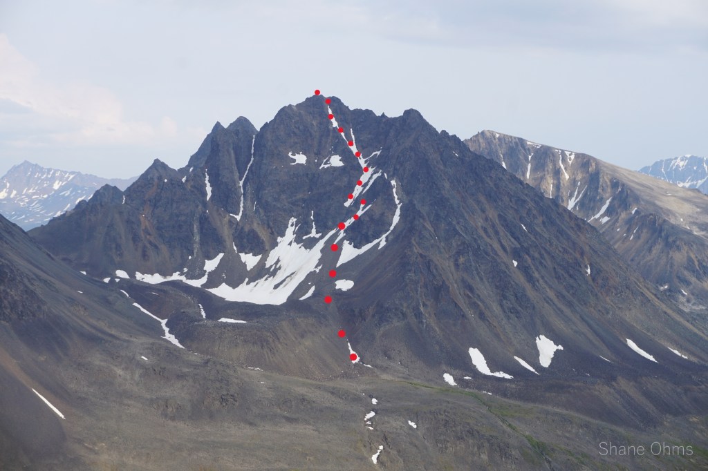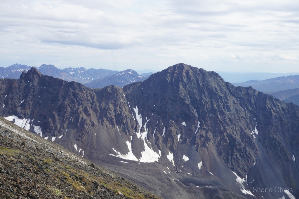 For Oganesson we took the SE face. This SE face and the following descent of it’s East Ridge, would be the most scrambly terrain we covered on the trip. But we shimmed and clawed, hee’d and haw’ed and made it atop. Again, no prior ascents found. Below the peak some caribou were enjoying the coolness of the snow in a high bowl. Unfortunatley, we would be kicking them out upon the eventual descent of Rusty Peak.