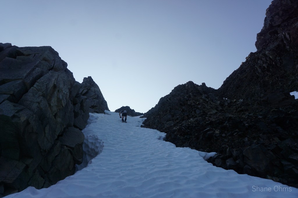 Starting for Tennessine Peak we plotted. We had seen the upper run of its north couloir from the elementary spire, but were unsure of the bottom half, or if the gradient would be too steep (rowland had axe and crampons, I had kathoolas and treking pole). Either way, it looked more promising than the west ridge (which I’d originally guessed as a route). Well, we crossed Honolulu Creek, went up and rounded the corner to see the bottom half of the Tennessine’s north couloir. It looked like a go!