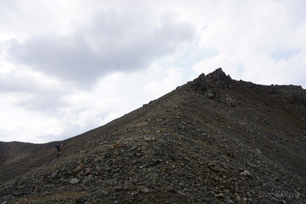 Back at the lake with Rowland, we dropped down from the pass just enough to sidehill into the south facing bowl located west of Bismuth Peak. I believe Rowland had pulled up some satellite imagery on his phone and so our exit was to be for that aforementioned old mine road. So we lugged the packs up to the ridgeline connecting Bismuth to Antimony. From here we ditched packs and made for the summit of Bismuth Peak.