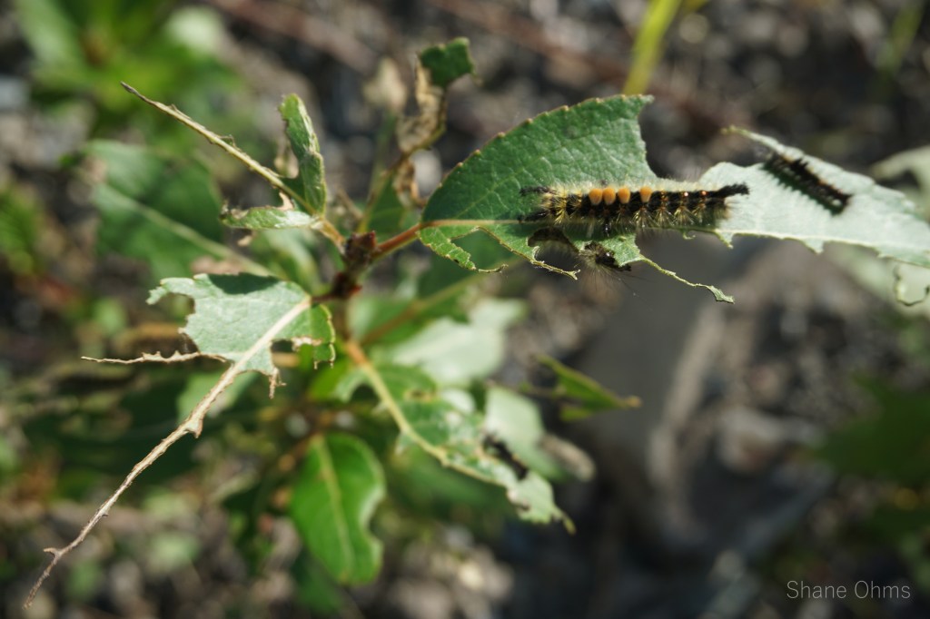 Back at our packs we dropped off the ridge via the one and only logical gully, which brought us into the bowl south of Antimony Peak. From afar the top of this gully might look questionable, but it is ok. With our overnight packs, we just took it slow. Once out of the gully, we had a brief walk over a rockfield (I found a plant fossil in here) and then we were homefree on an old mine trail. No worries, other than being dry on water on a hot hot hot summer day. Back at the road, Rowland attempted to hitchhike but ended up jogging the whole 2 miles back to get the car. I took pictures of bugs harvesting from the roadside fireweed.