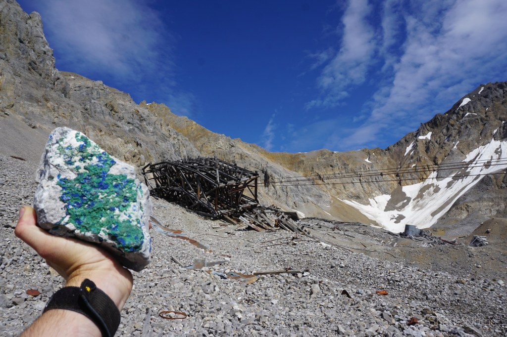 It was an insanely hot day. Two of the three structures pictured in the NPS pdf attachment were no longer standing. And so, their unphotogenic rubble was passed up in favor of chasing around the cliffsides to find the source of those green pixelations my camera had found two years prior from atop Bonanza Peak. Some National Park people came in by helicopter for a couple hours to do an annual check on the locked gate barring entry to the underground mine system. We did successfully find some of that deep, dense, green rock. And then we hiked back to Rowland’s campervan.